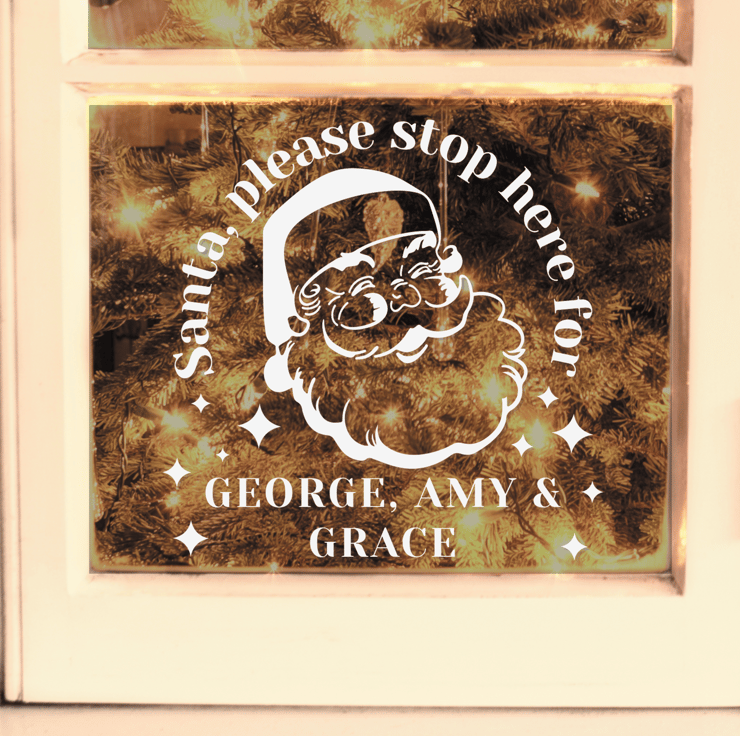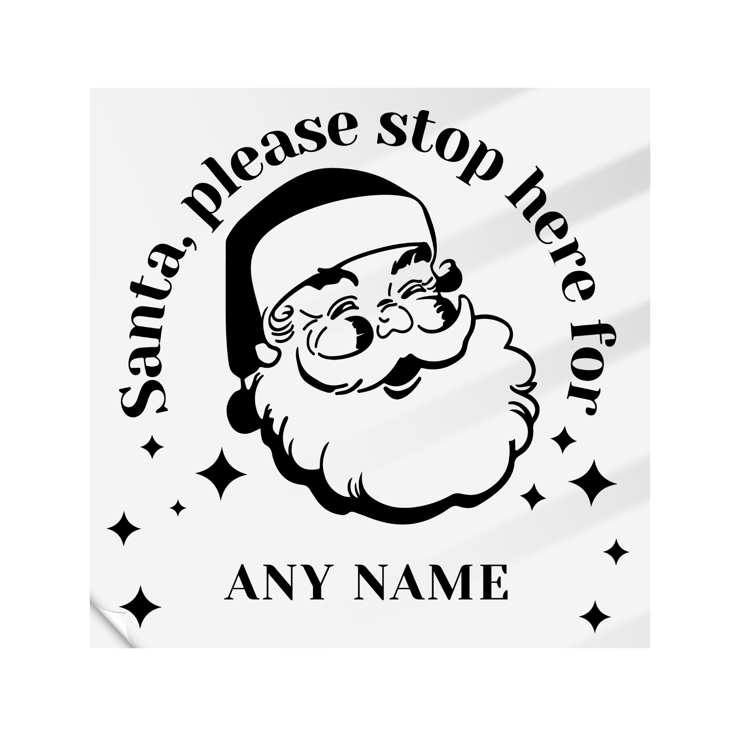 Make sure Santa doesn't miss your house with our Personalised Santa Stop Here Window Sticker! Add your kid's name for a custom touch and bring effortless holiday spirit to your home. Easy to apply and remove. Order now and let the festivities begin!
