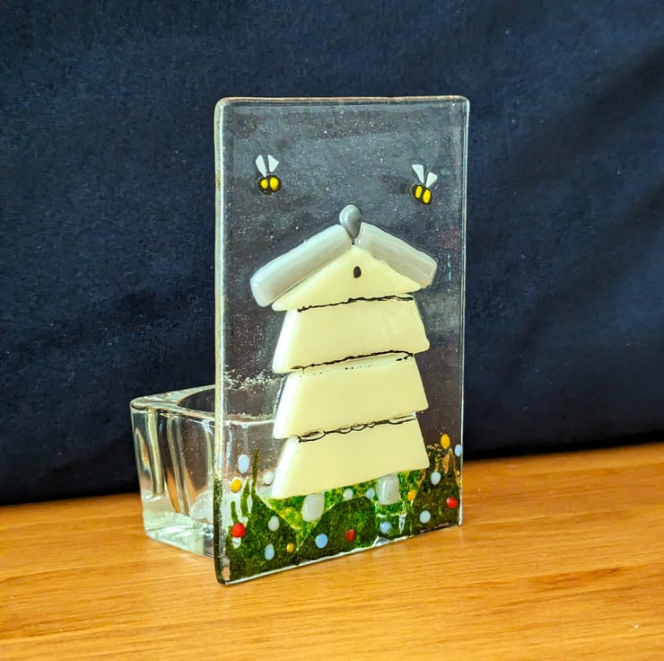 The front fused glass panel is made from clear glass with coloured glass beehive, coloured glass elements then mounted onto a clear glass holder