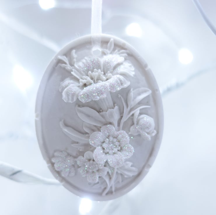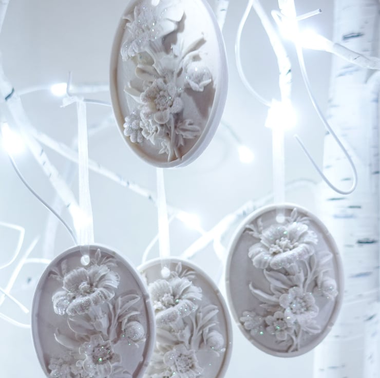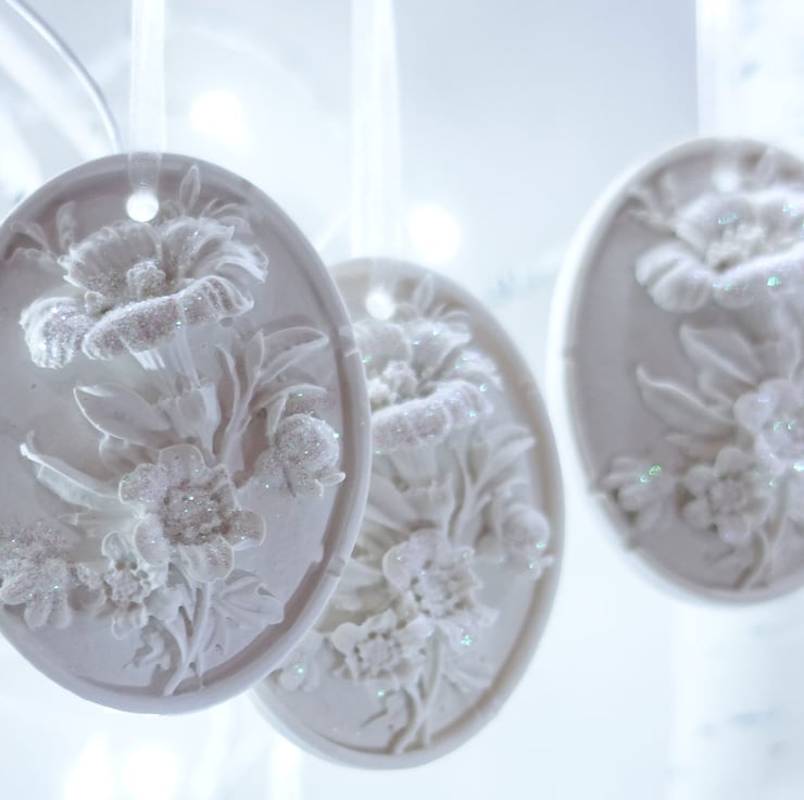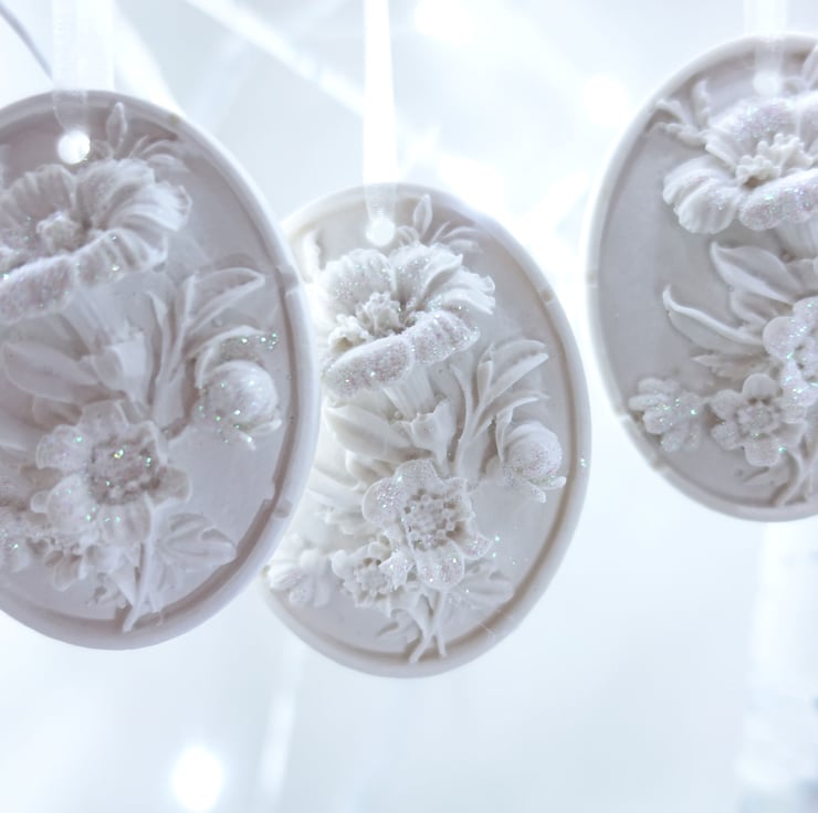 This trio of gypsum white bas relief Regency style scented decorations to hang on your Christmas tree if you want to recapture the natural fresh scent of a real Christmas. Each one hangs from a 3mm taffeta white ribbon and measures approx 4 inches at the deepest point.