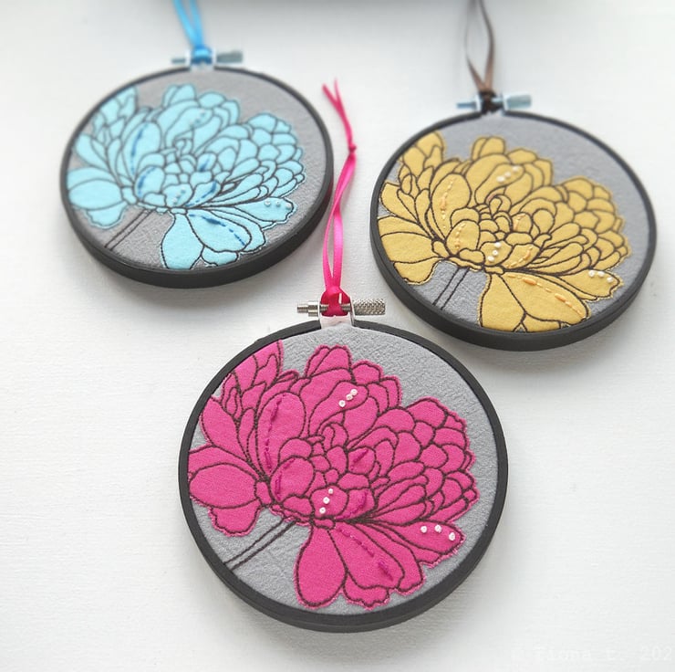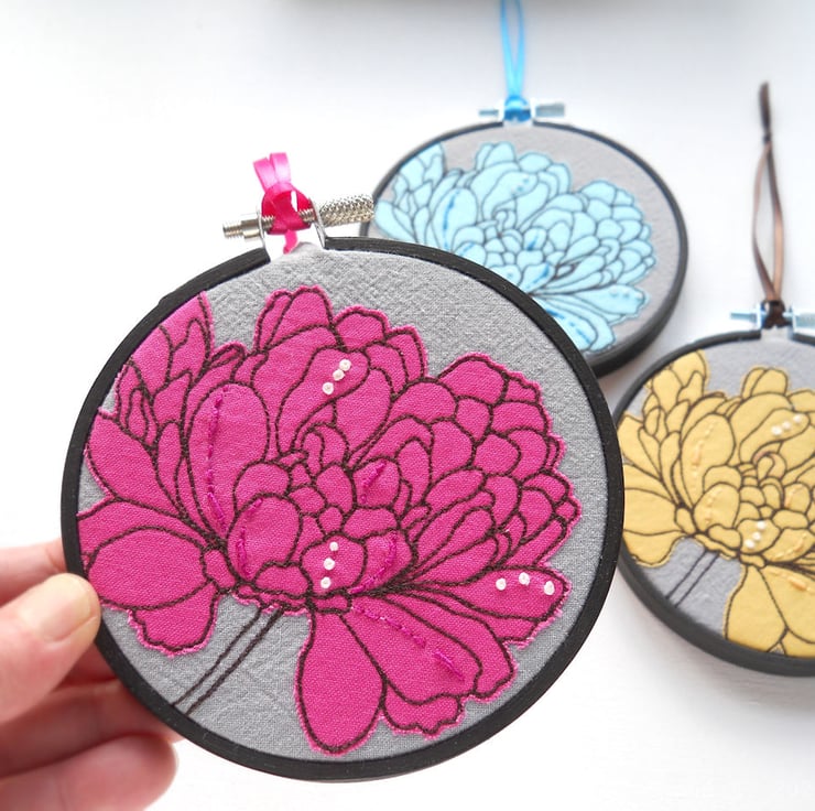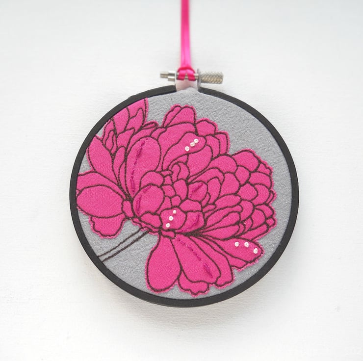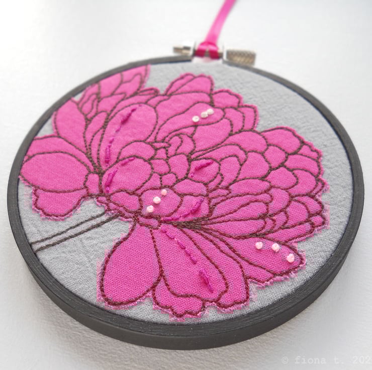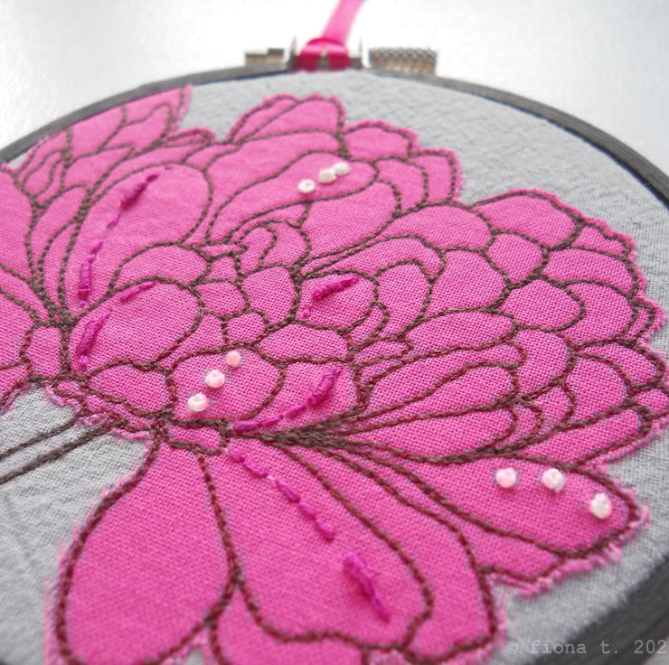 translated from my original pencil drawing, this small emerging flower is free hand embroidered in bright pink cotton on to hand dyed grey cotton calico.