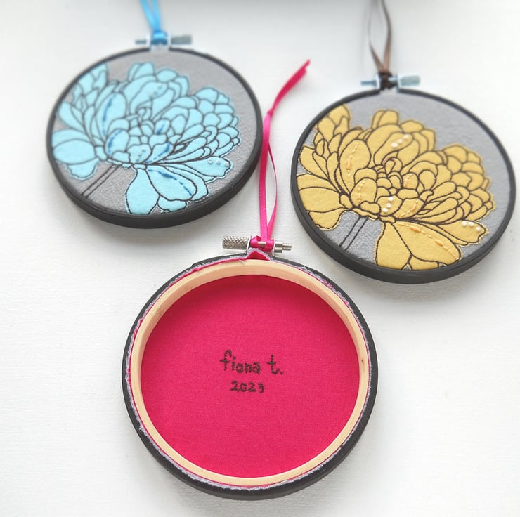this textile sketch is mounted in a 4" black painted bamboo hoop, and is signed & dated on the reverse, in freehand stitched text, on a coordinating hot pink cotton.