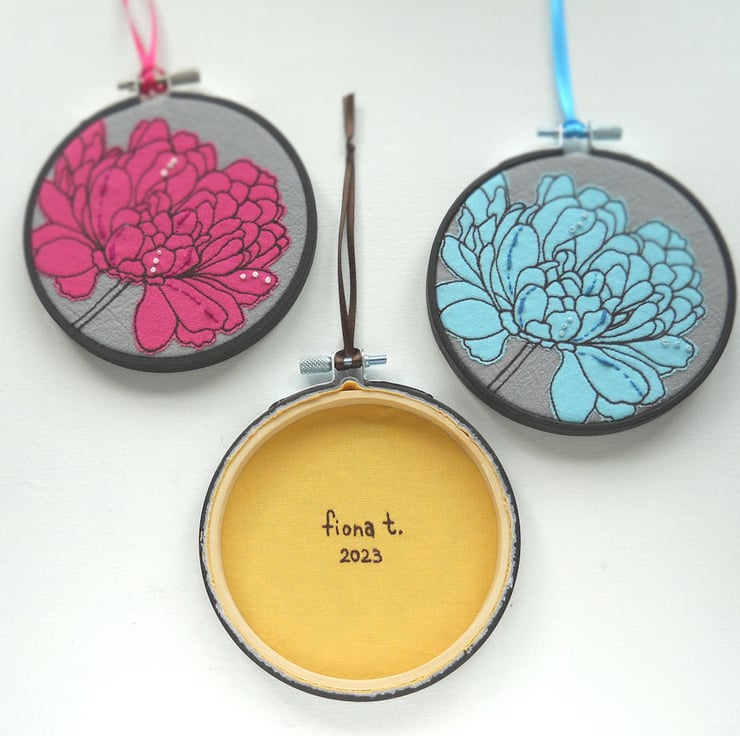 this textile sketch is mounted in a 4" black painted bamboo hoop, and is signed & dated on the reverse, in freehand stitched text, on a coordinating bright yellow cotton.
