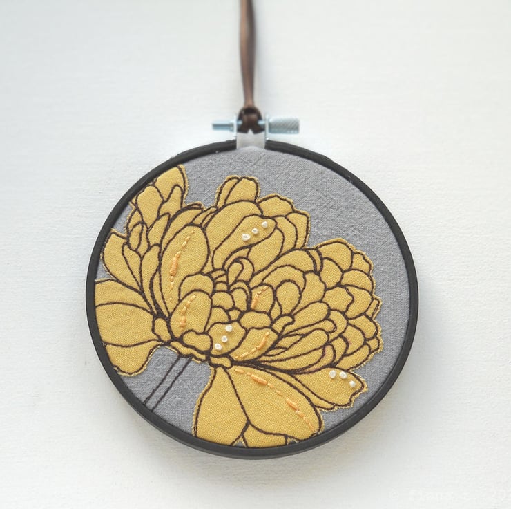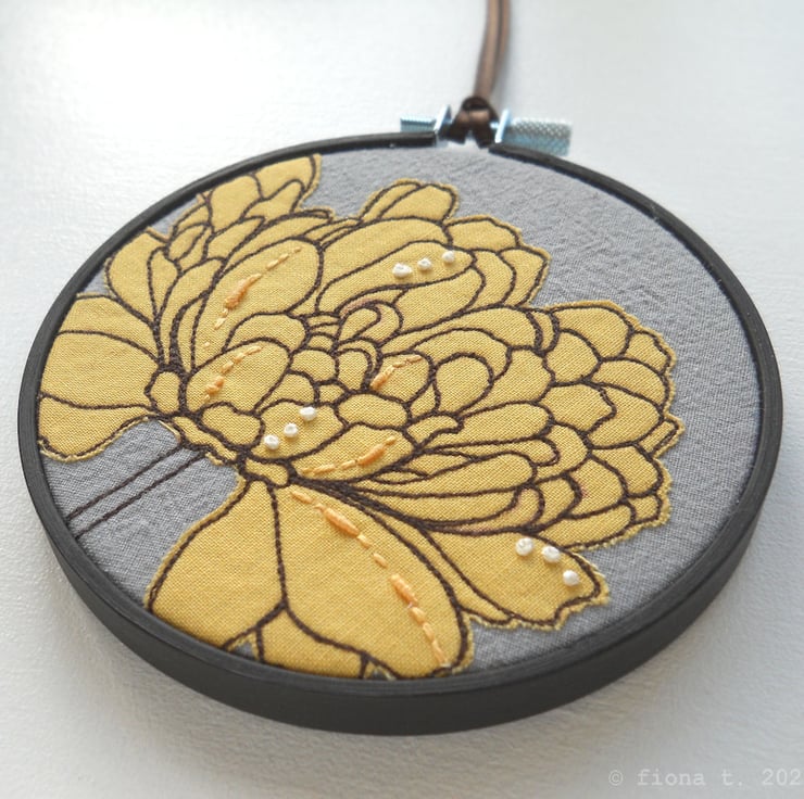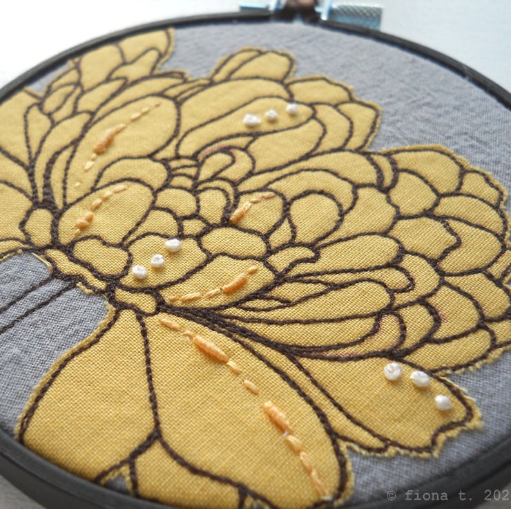 translated from my original pencil drawing, this small emerging flower is free hand embroidered in soft buttery yellow cotton on to hand dyed grey cotton calico.