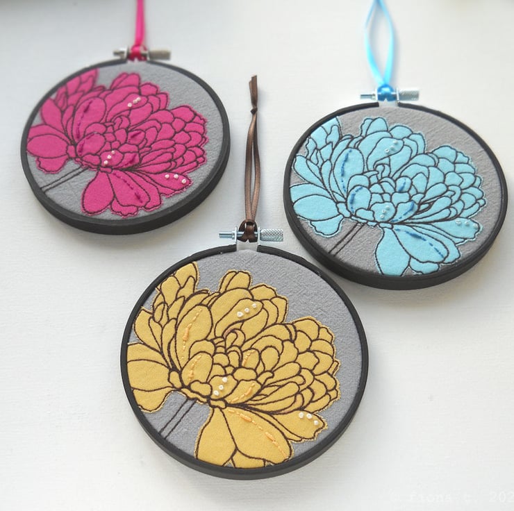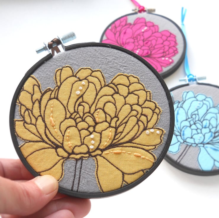 original floral textile art - free motion embroidered raw edge applique, with hand embroidered embellishments, in a 4" painted hoop.