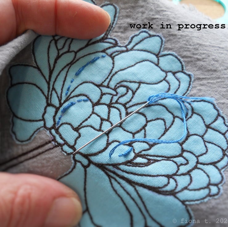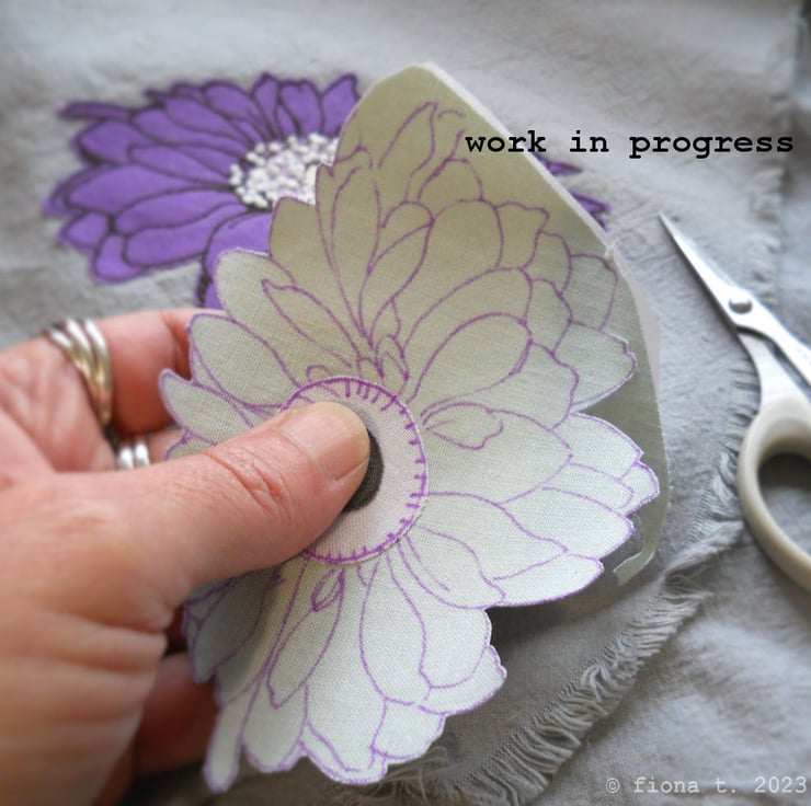 the fabric is hand cut, layered and appliqued onto calico, before drawing the details on freehand, using free motion embroidery.