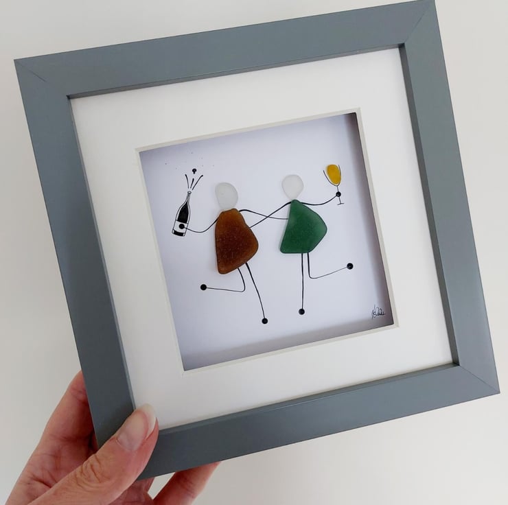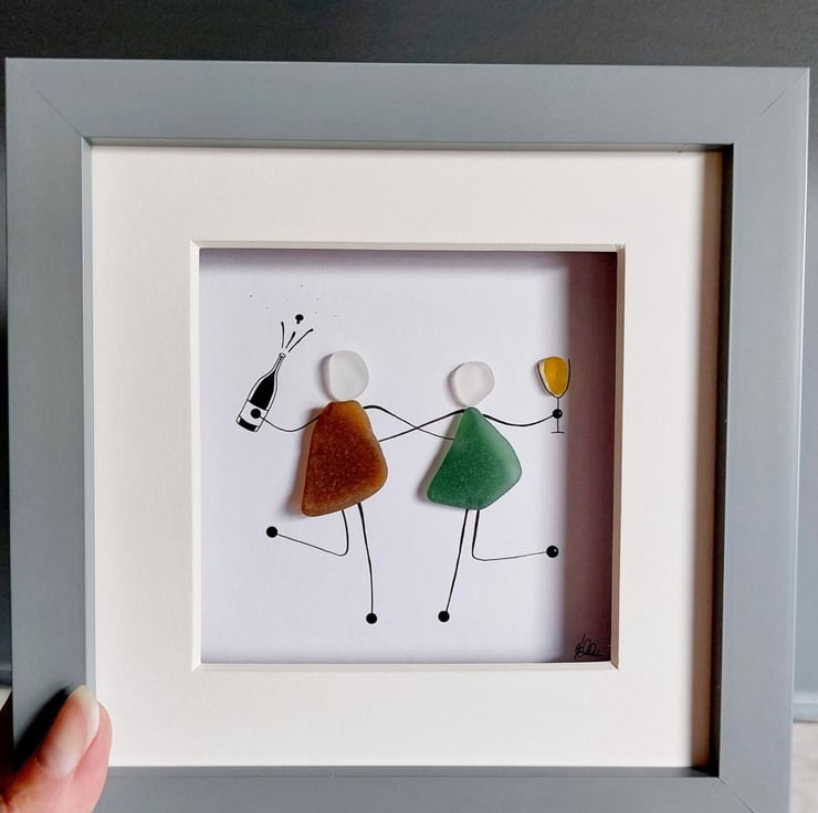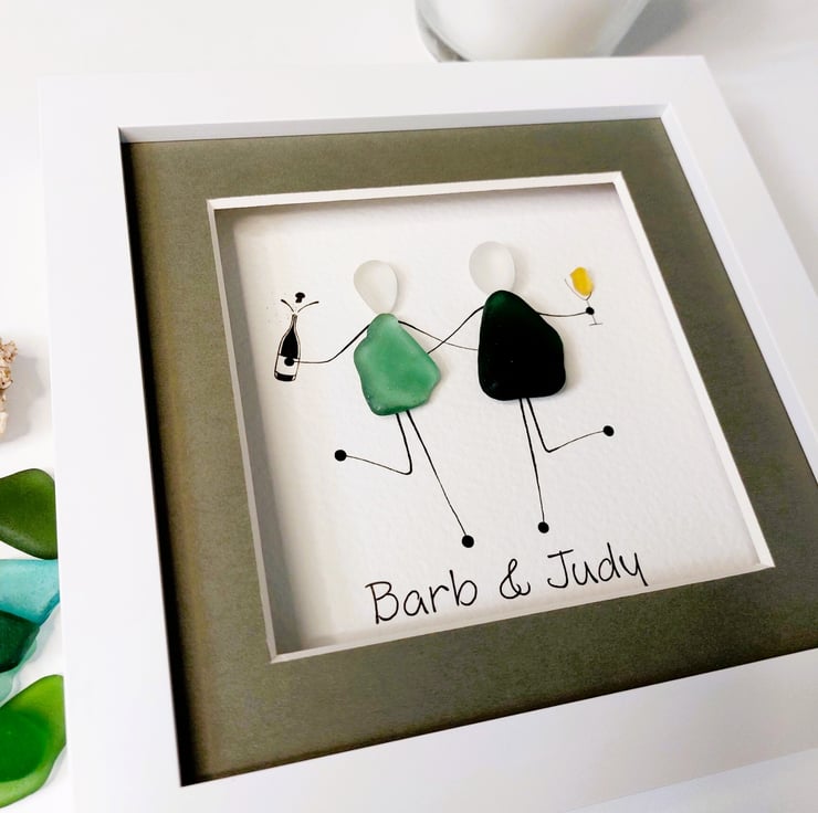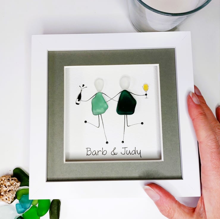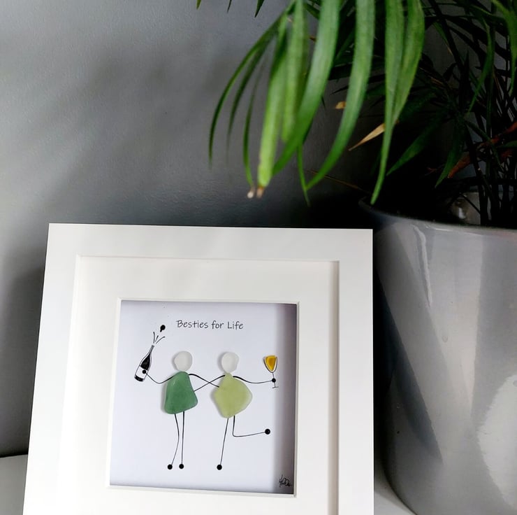 Commission a customised friendship picture as a gift for your bestie. This popular design now comes in a 17.5cm frame, available in white, grey, or black, with an attached stand. It's a simple yet elegant tribute to the celebration of friendship. Each piece is crafted to order with sea glass collected from my beachy travels. Personalise it further with your choice of text, mount, and frame colour to make an ideal gift for a friend or family member.