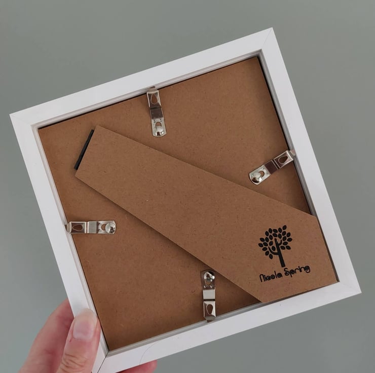 - The frame is 17.5cm square, made from acrylic and has a stand attached so you can display it straight away. Choose from three mount and frame colours to create your perfect gift. The mounts are cut to an aperture of 10cm