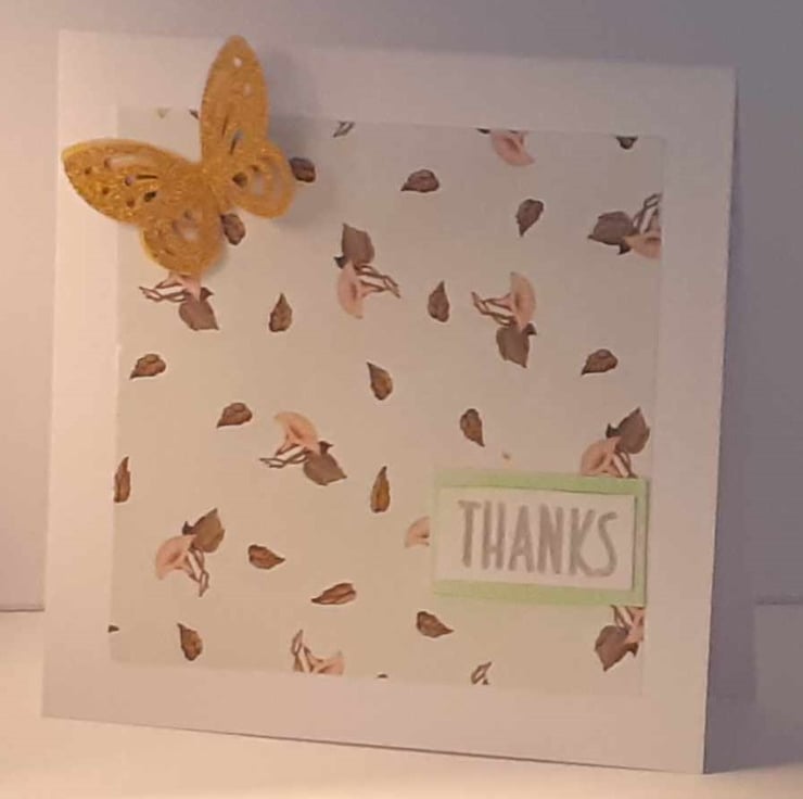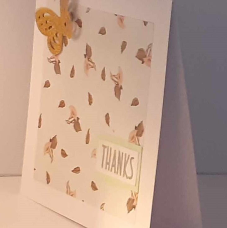 This card is Thank You Card to send love to the ones we care about. This card has a white mat where a light blue flowered background is placed. The card has a 3D gold glitter butterfly. A great way to say thank you to your loved ones.