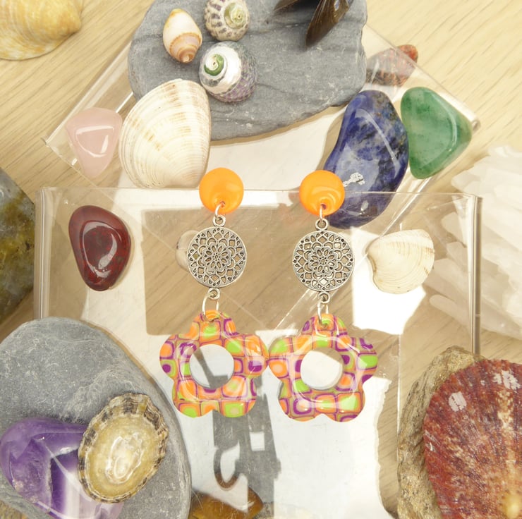 Pair 4 - orange circle stud, silver plated mandala charm, flower dangle. Stud posts stainless steel, approx 6cm long