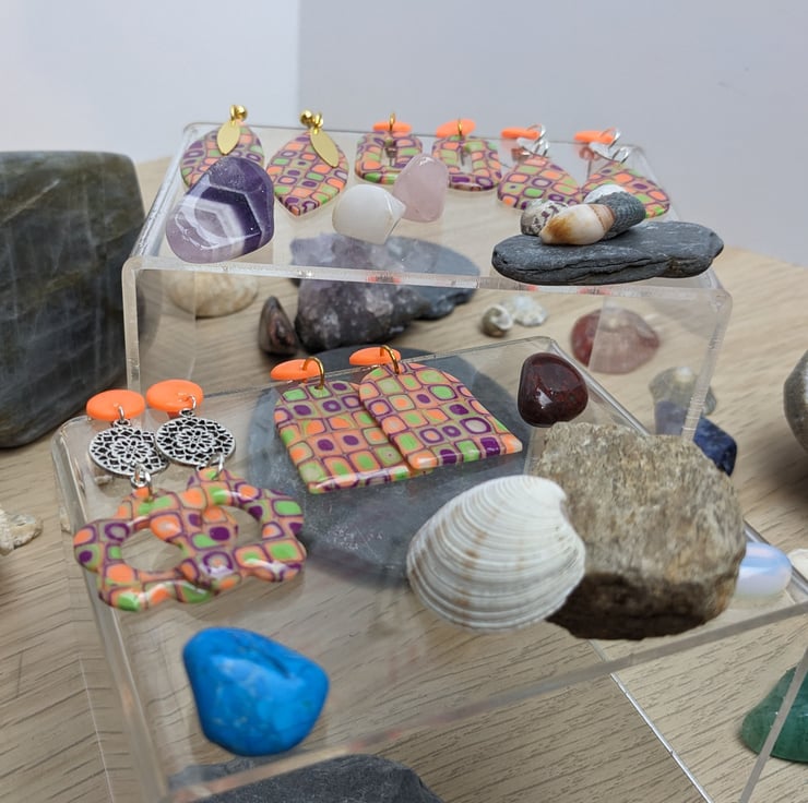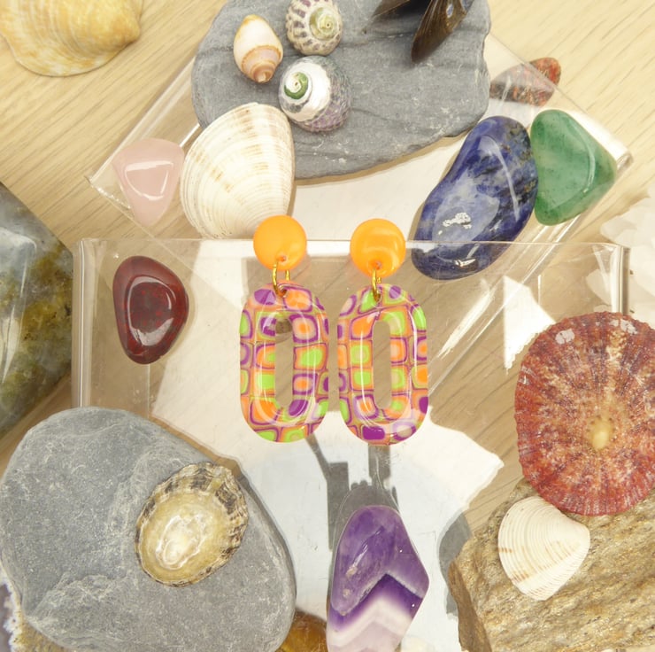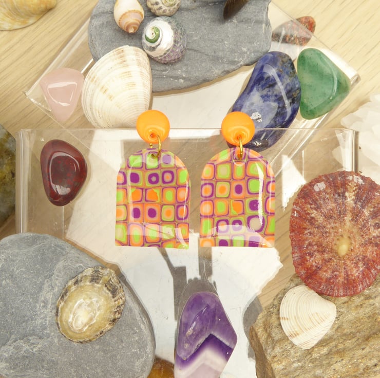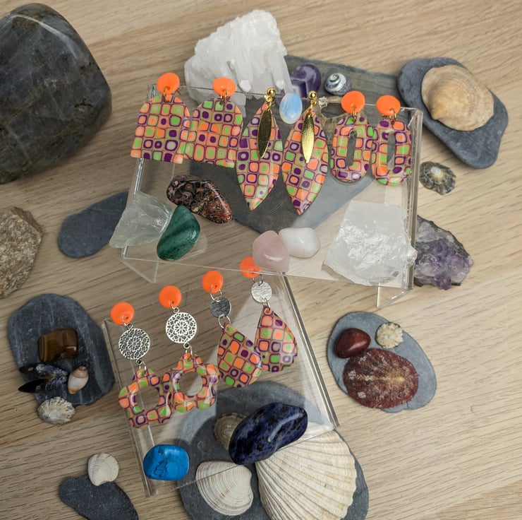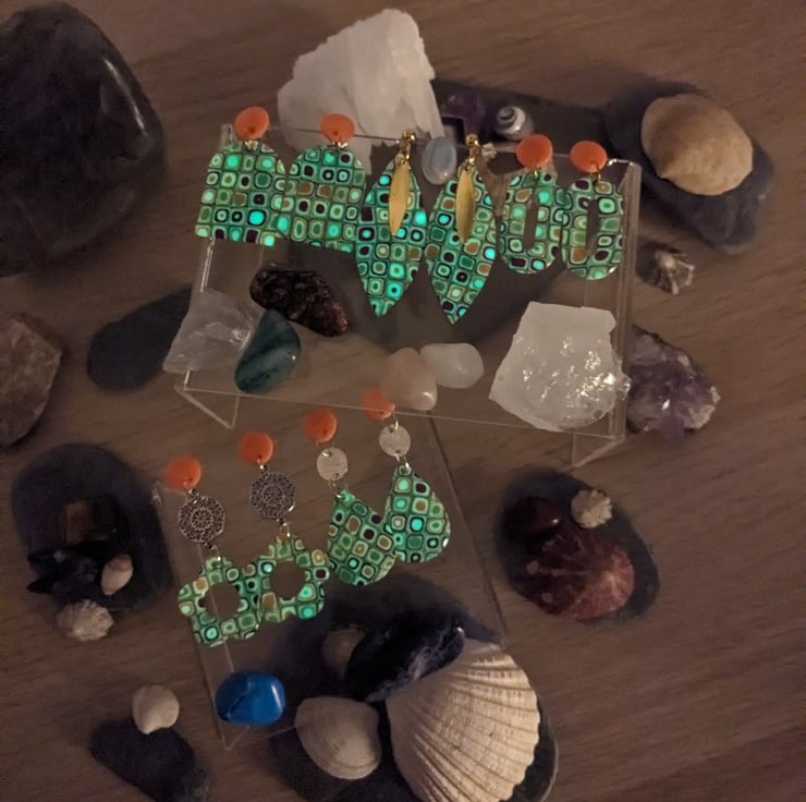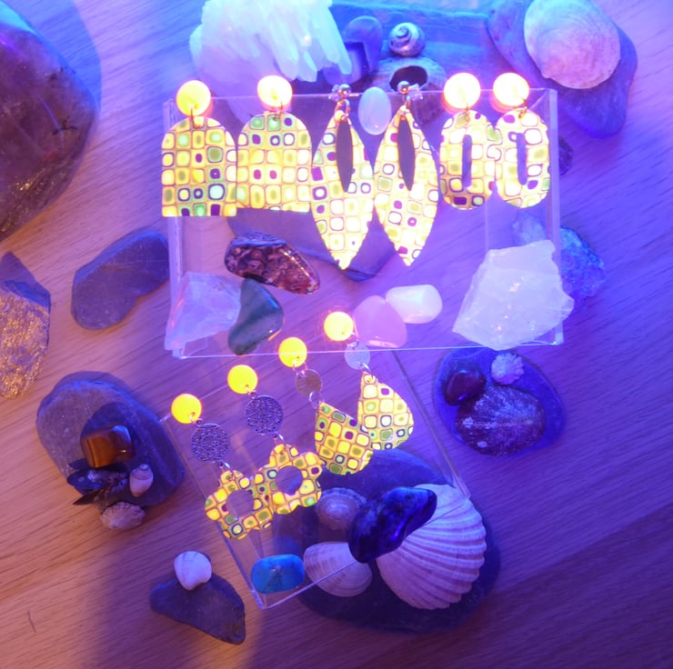 These lightweight earrings are made from polymer clay in neon green and orange shades, purple and a glow in the dark neutral tone. The neon colours will glow under a UV light/blacklight and the neutral off white tone will glow green in the dark.