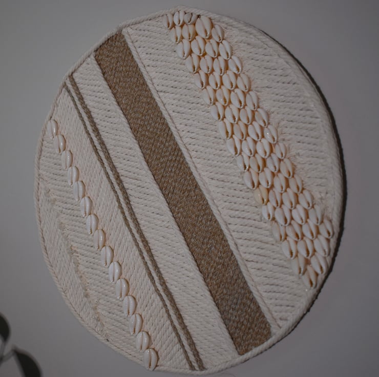 This wall hanging has been handcrafted using natural mixed jute rope and off white cotton macrame cord and decorated with cowrie shells. The diameter of the hanging measures 31cm (roughly 12 inches) and comes with a pre-fixed picture hanger hook.