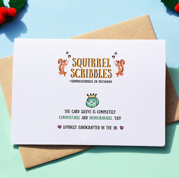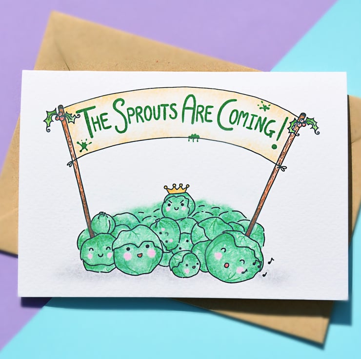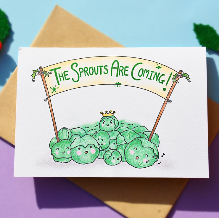 A sprout filled Christmas card! Watch out, the sprouts are coming!! This funny Christmas card is handprinted on textured card and glittered by hand!