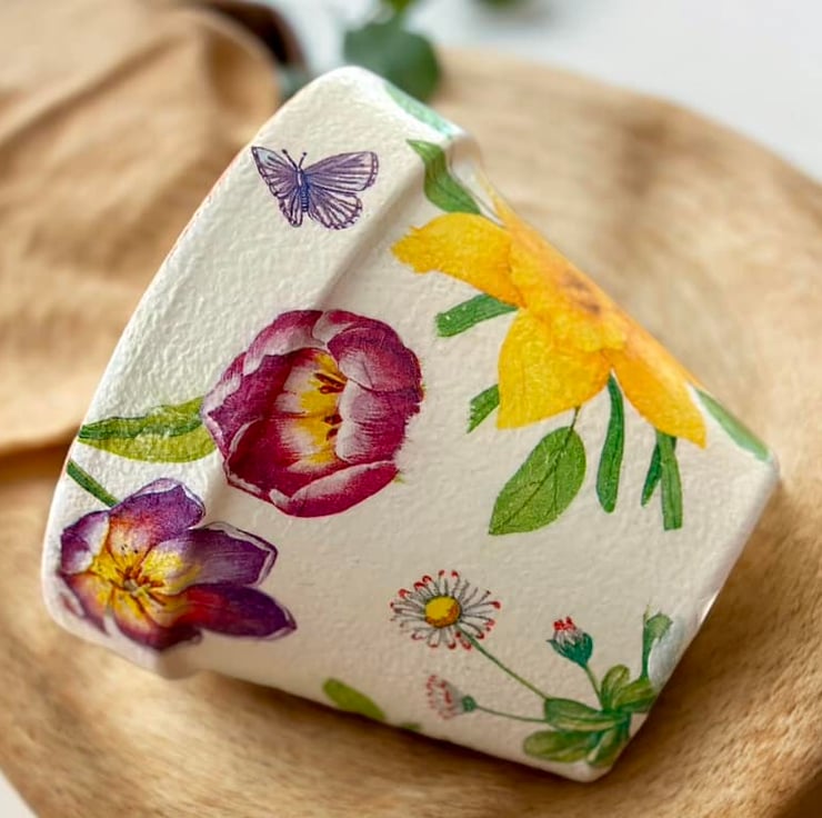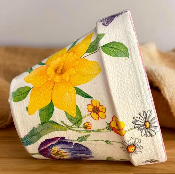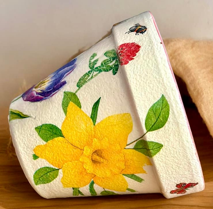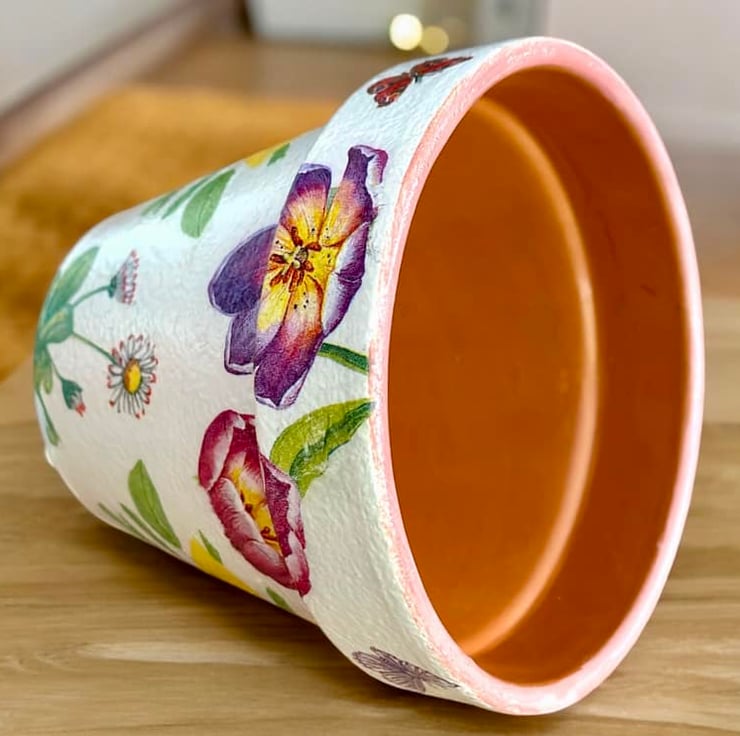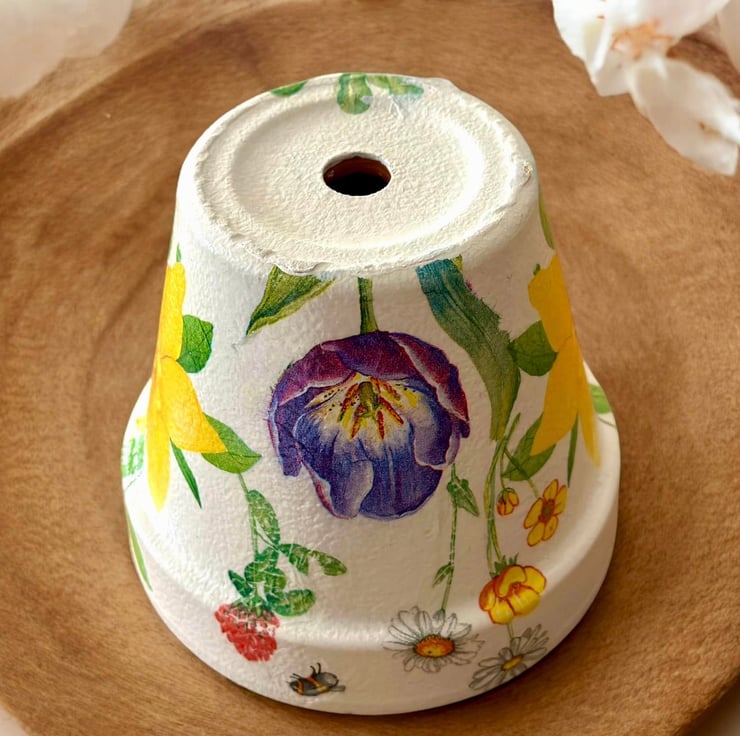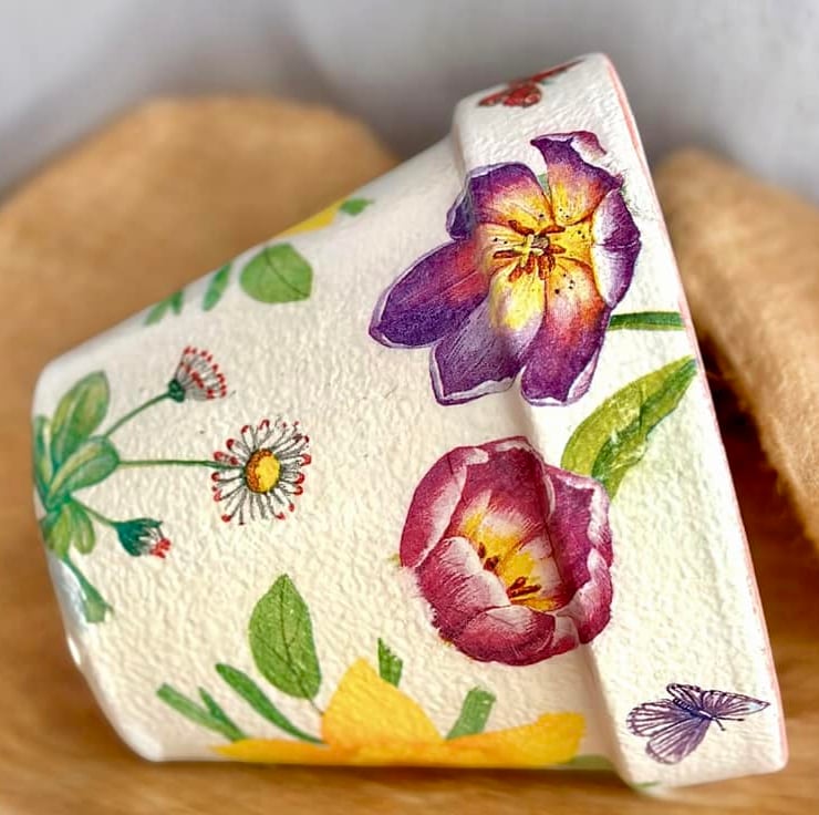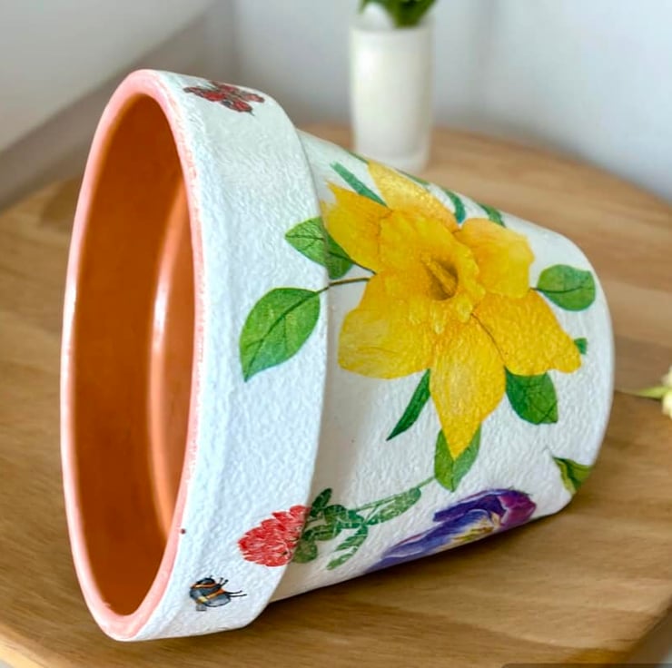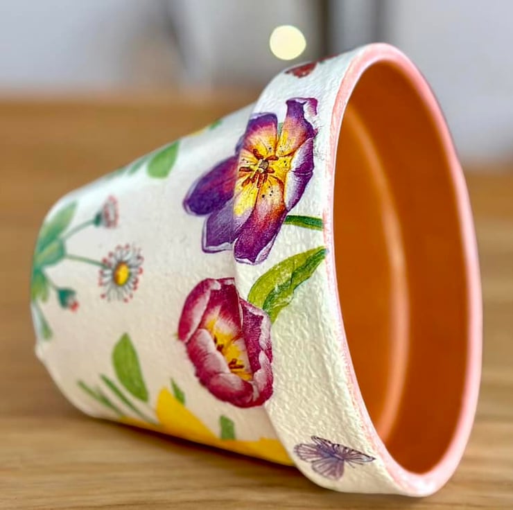 The image has been applied to a terracotta pot after being painted with Annie Sloan chalk paint using the art of Decoupage and finished a water resistant varnish.