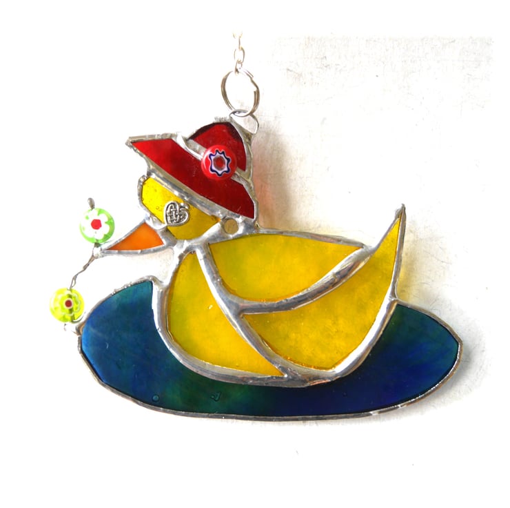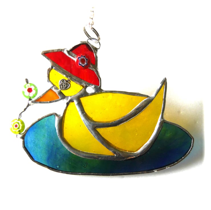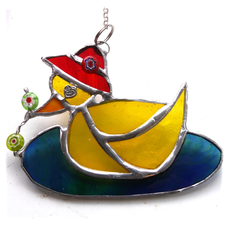 The suncatcher hangs by a little silver chain is securely attached to the duck’s hat. .
