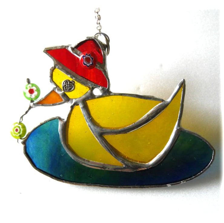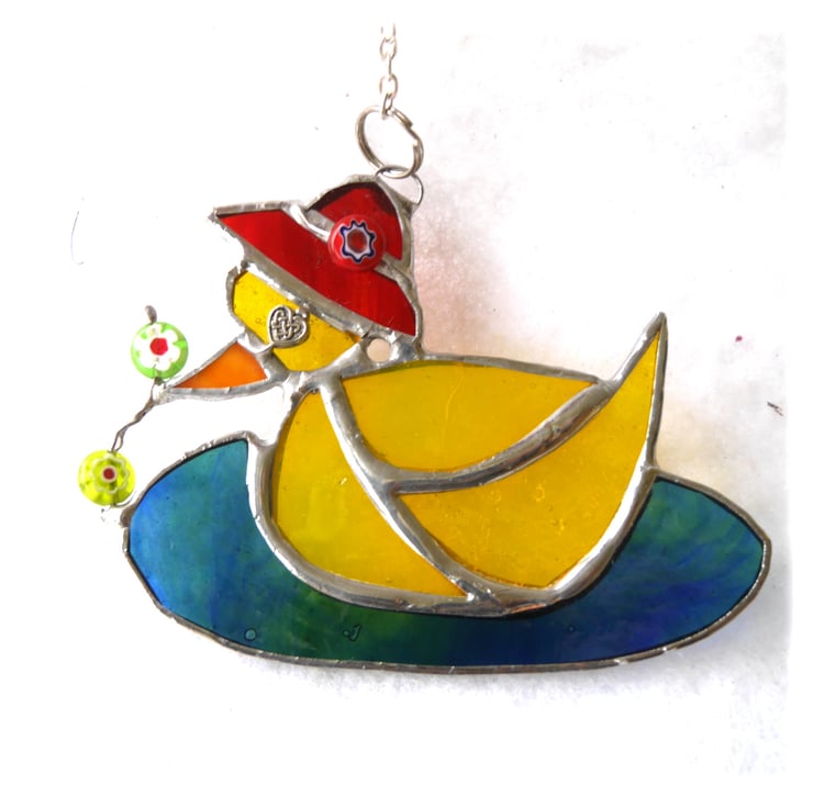 The little duck is swimming on a pond of bright greeny blue textured glass and sports a red hat with a flower bead decoration. It has a piece of green flowering weed, made from glass millefiori beads, in its beak.
