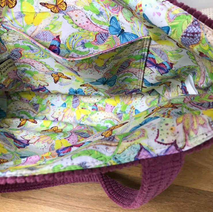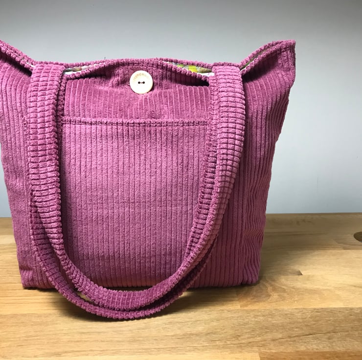The bag is made with a jumbo cord that is very tactile and soft to the touch yet durable and strong to use. The bag size is based on a sweater sized project bag but can be used for anything you want. The majority of these bags sold are for general use from day to day activities to travel. The size is perfect for many purposes. The outer is a jumbo or 4.5 wale cord and the lining a beautiful printed cotton. The approximate size is H: 10.5" x W: 10.5" x D: 4"