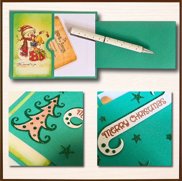 Green: It displays a Christmas picture with a Snowman on the gift card pocket. All ephemera are die-cut from green glitter card & gold mirror card & is embellished with colour drops & craft gems.