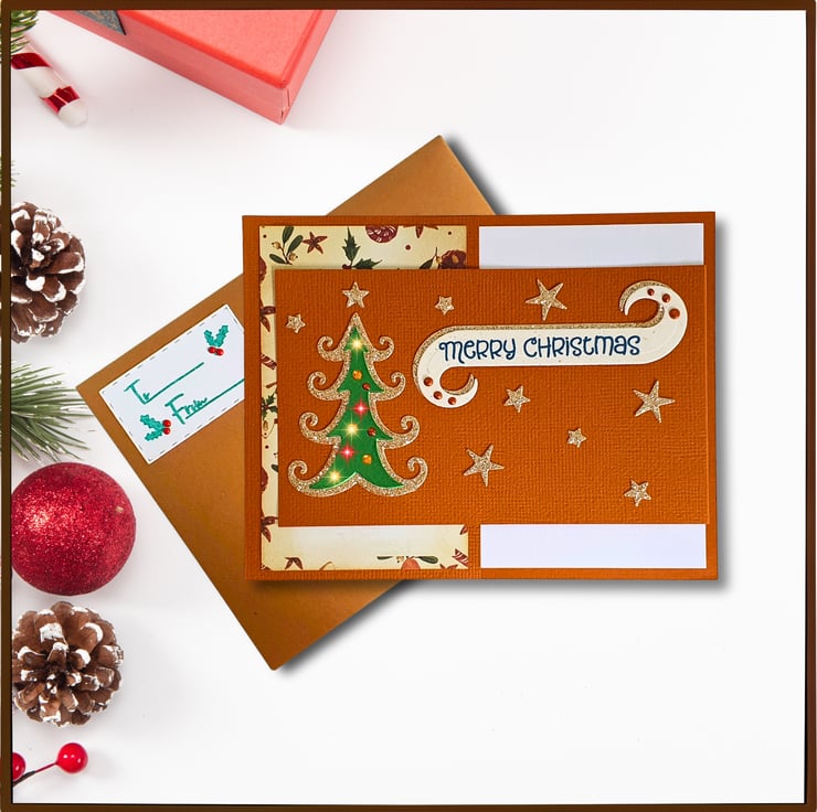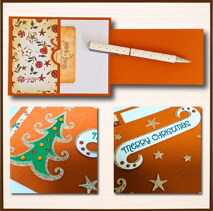 The card holder pocket is on the left hand side of the card & is decorated with a Christmas picture. On the right hand side, there is a blank insert, ready for your wishes to be written on it. A smaller flap folds over from the right hand side, decorated with a Christmas tree, stars, & the sentiment "Merry Christmas". It comes with a matching, handmade envelope, that has also been heat embossed.