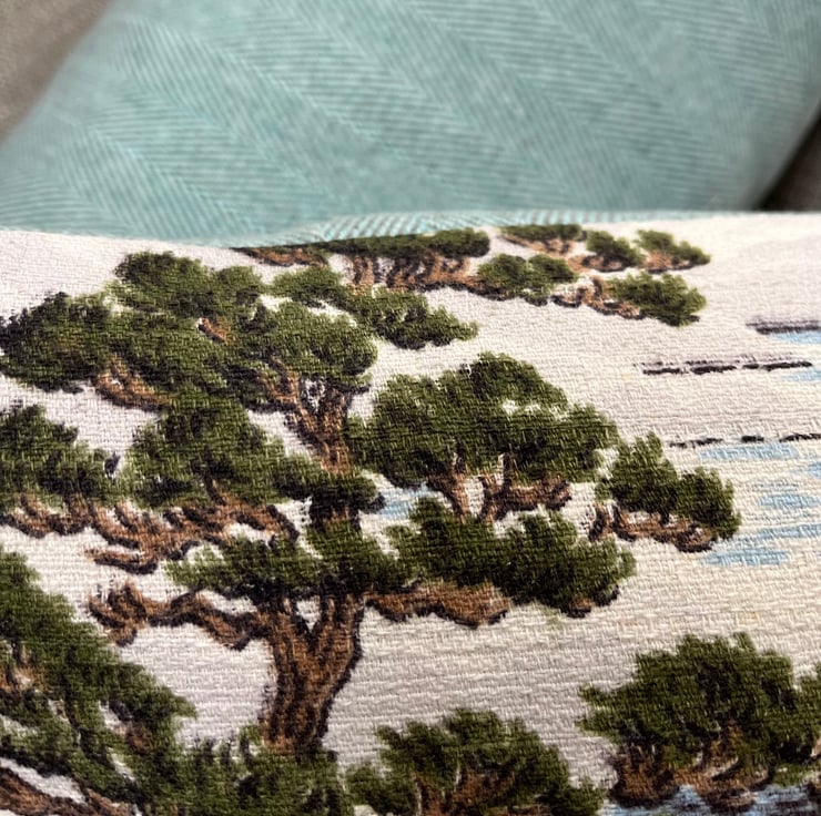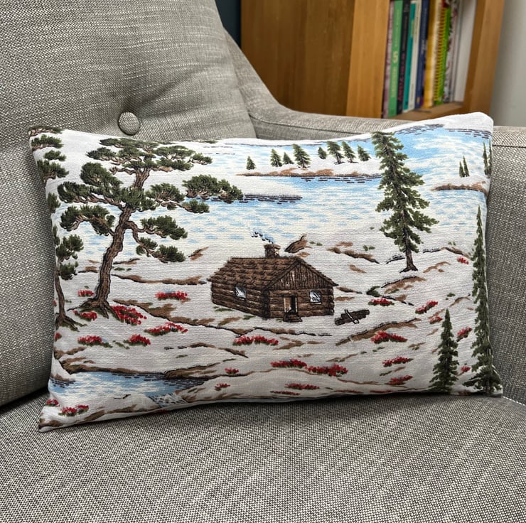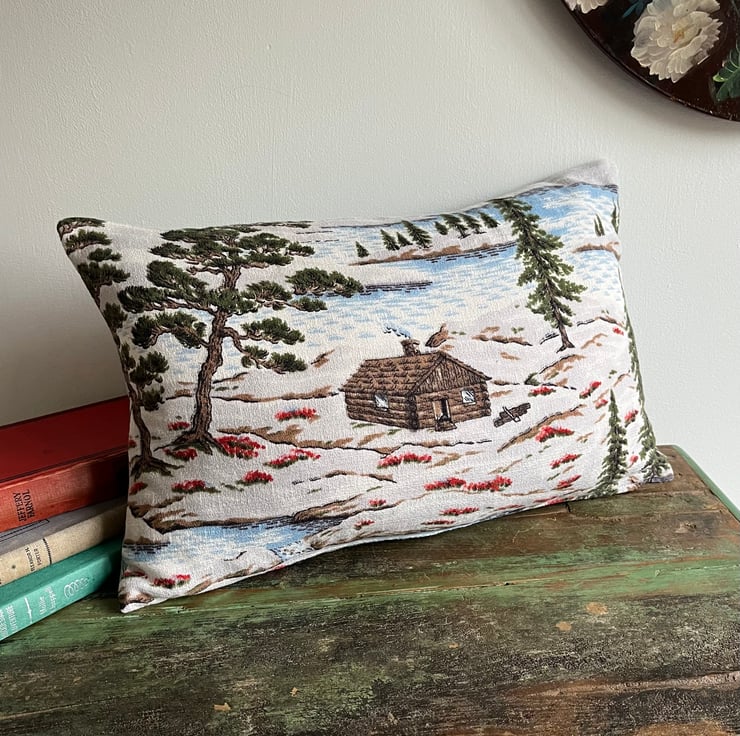 Beautiful feature cushion cover made from reclaimed vintage barkcloth from a curtain with an idyllic log cabin scene in a snowy landscape. The cushion cover is backed with wool-rich herringbone fabric in grey and blue.