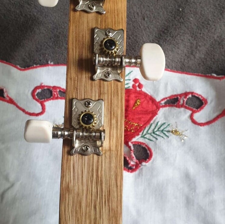 The fingerboard is beautiful walnut, all the wood is reclaimed, hand made by a carpenter with 40 years of experience.
