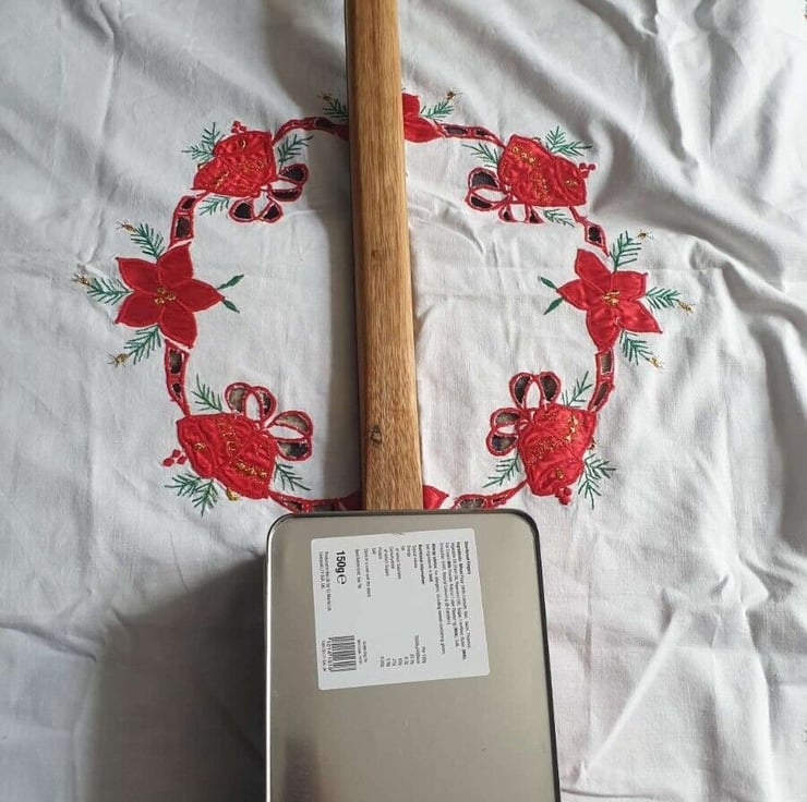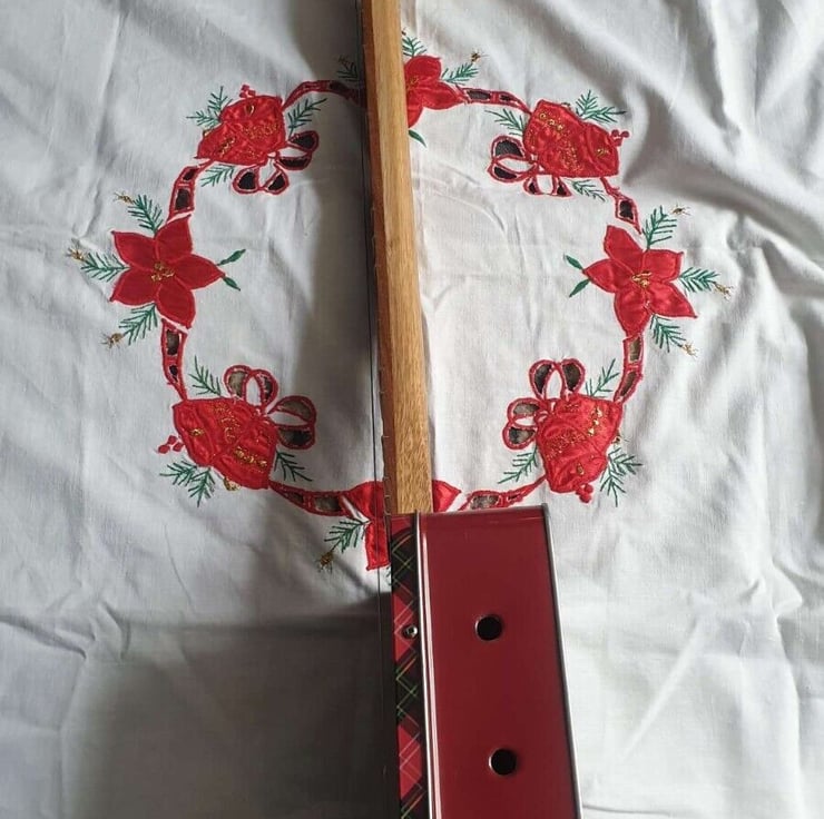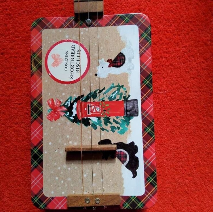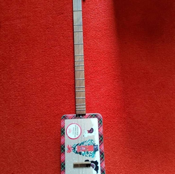 Perfect for Christmas, made from a Christmas short bread tin, this is a right handed, 3 string instrument with 15 frets.
