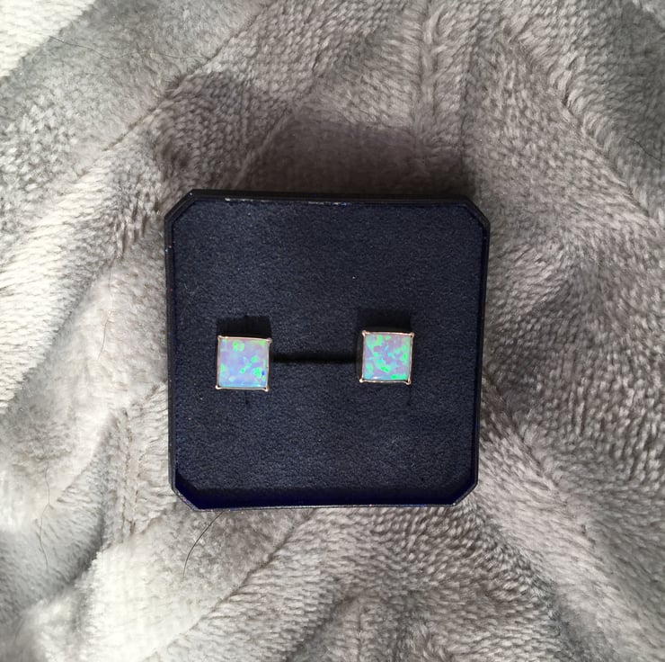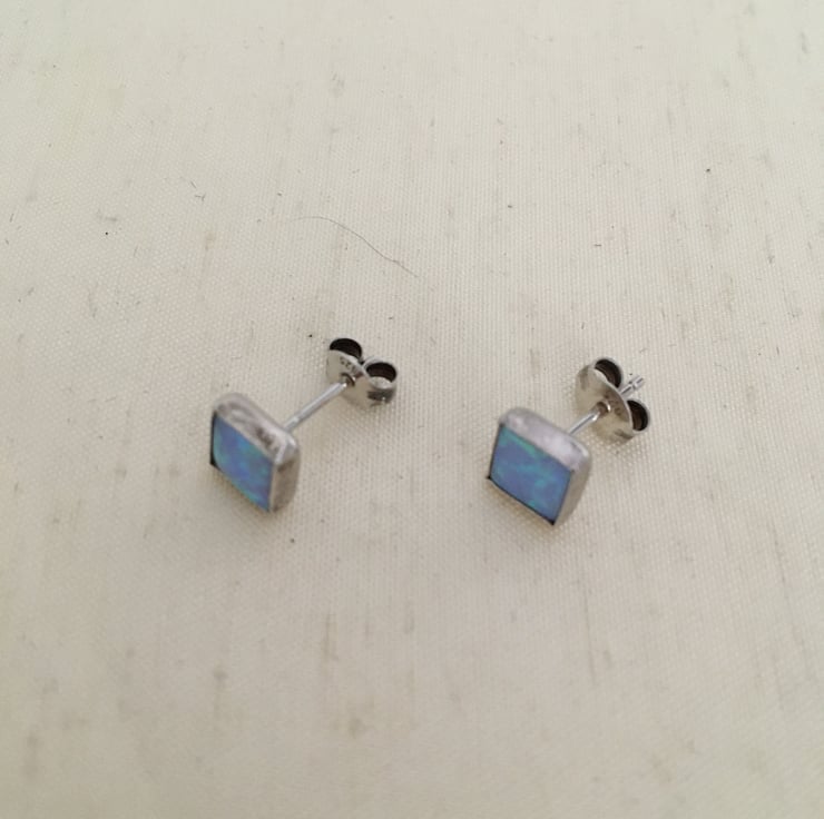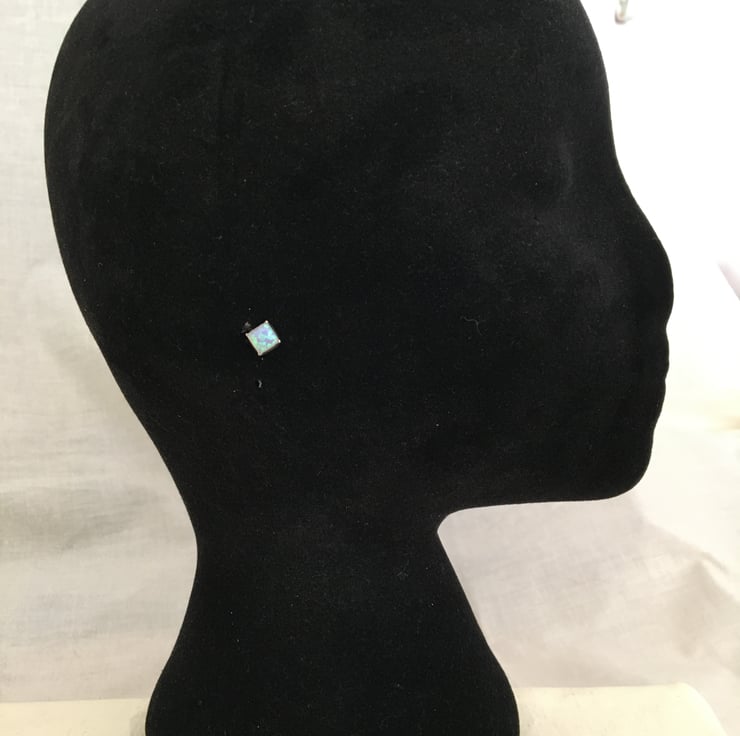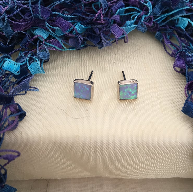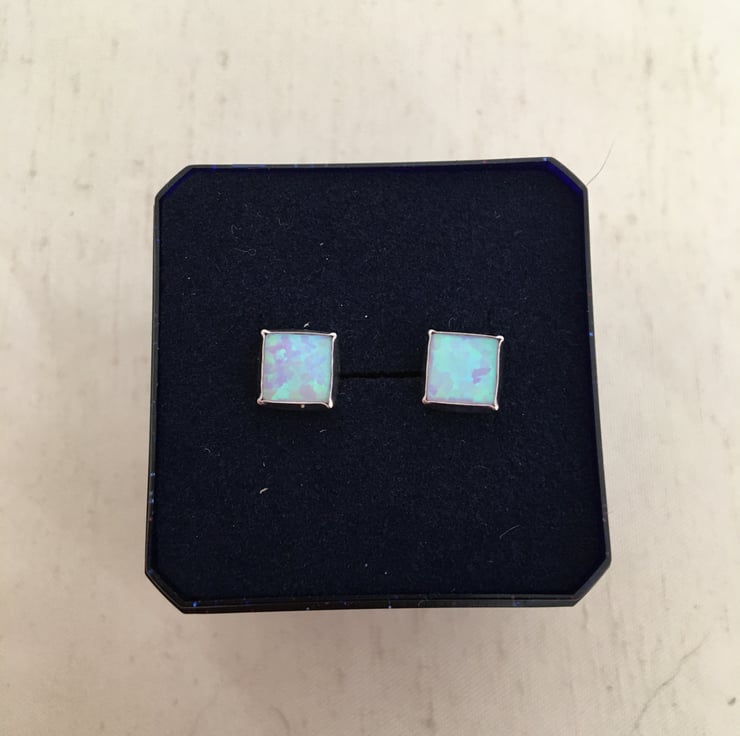 Delightful dainty square studs with faux opal centrepieces set in St.Silver.