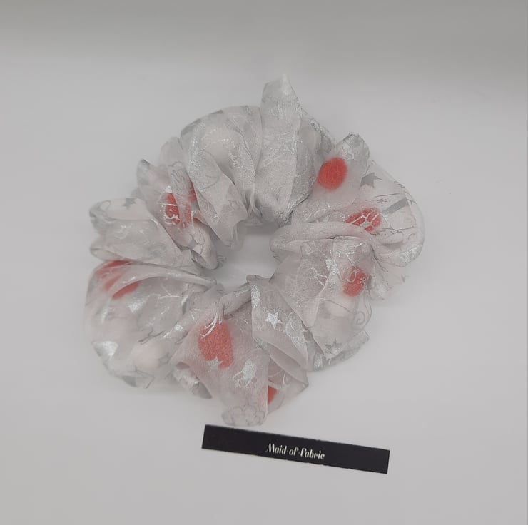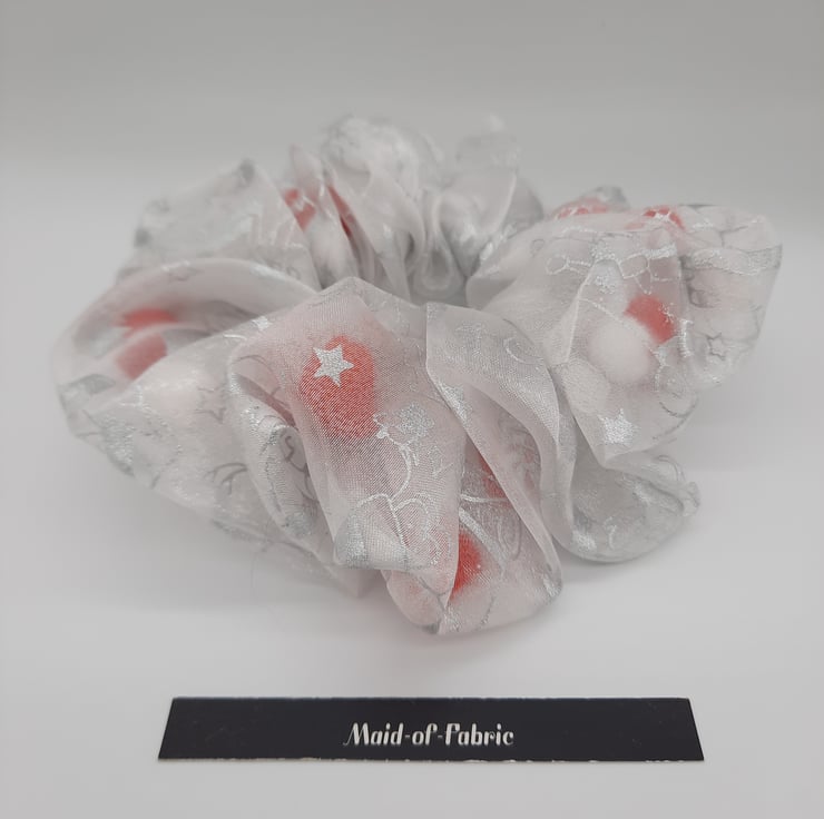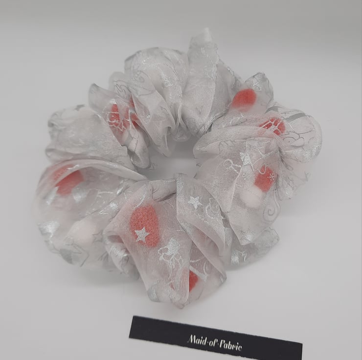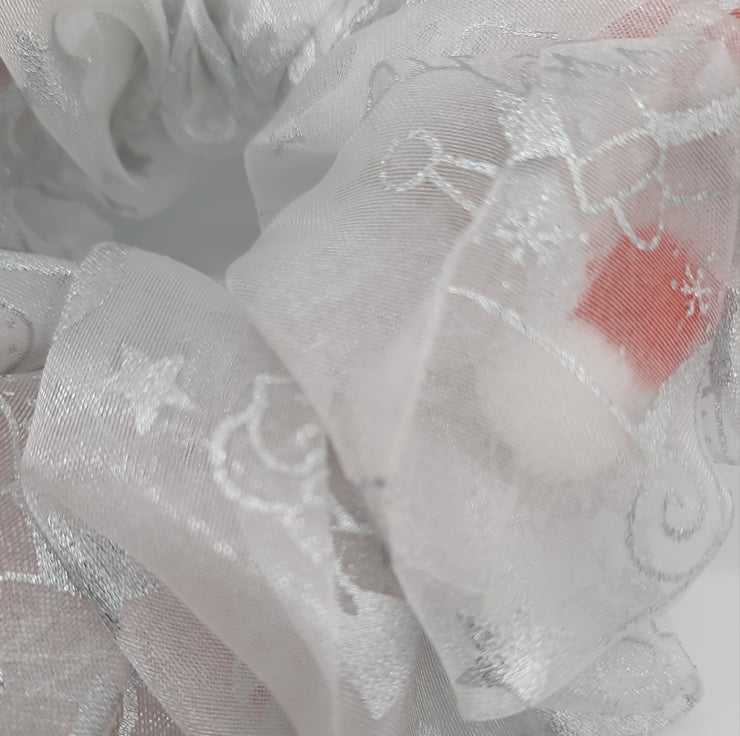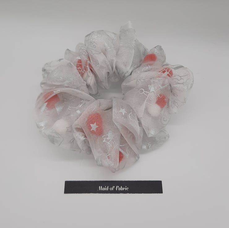 Made using a white and silver Christmas print net. White elastic and filled with red and white felt balls.