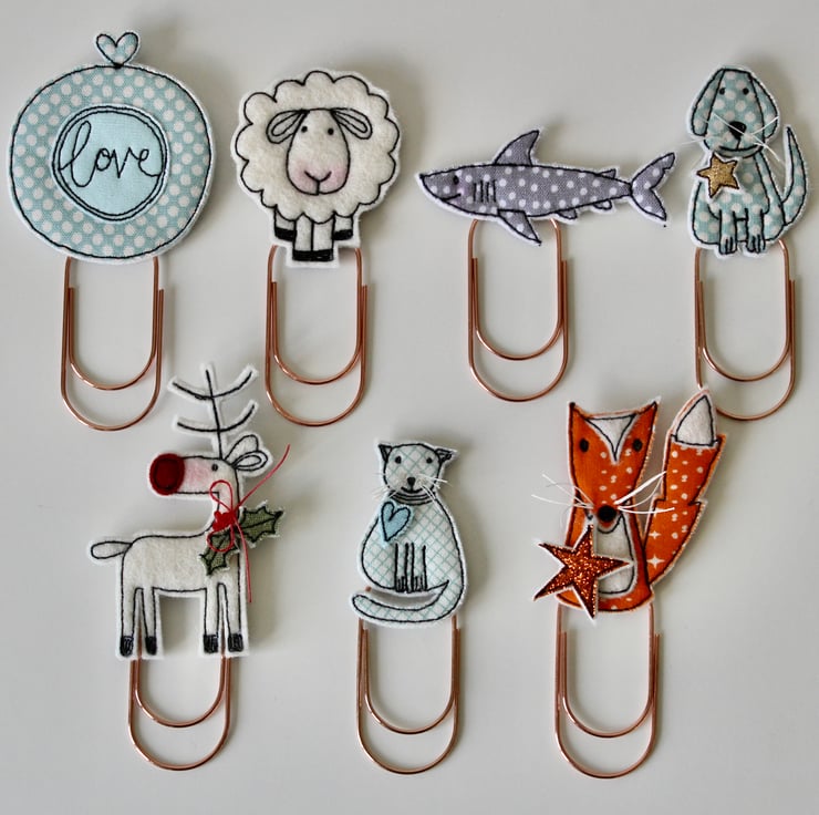 Each paperclip book mark is created using multiple layers of cloth, sewn using freehand machine embroidery and then cut out by hand. The rose coloured metal paper clip on the back is attached with hot glue and a sewn fabric circle to secure.