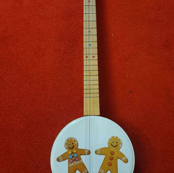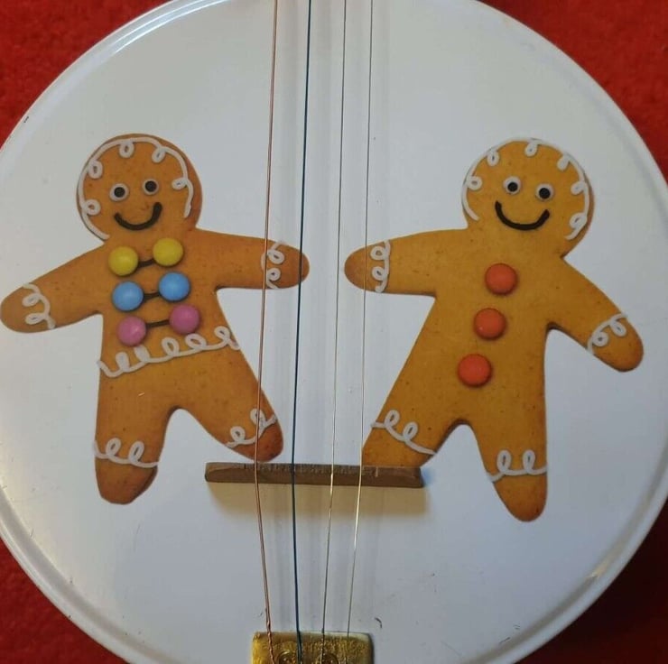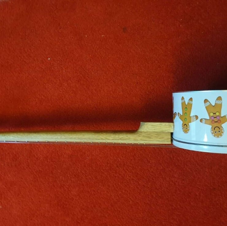This is a right handed musical instrument and the body is made from a festive gingerbread man cookie tin!