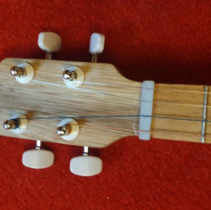 There's 19 frets, the neck is reclaimed hardwood, the fretboard is beech, and the overall length of the item is approx. 71cm, with a width of 20cm and a depth of 10cm.