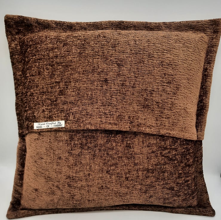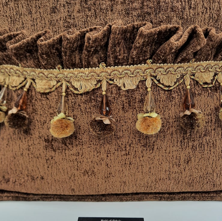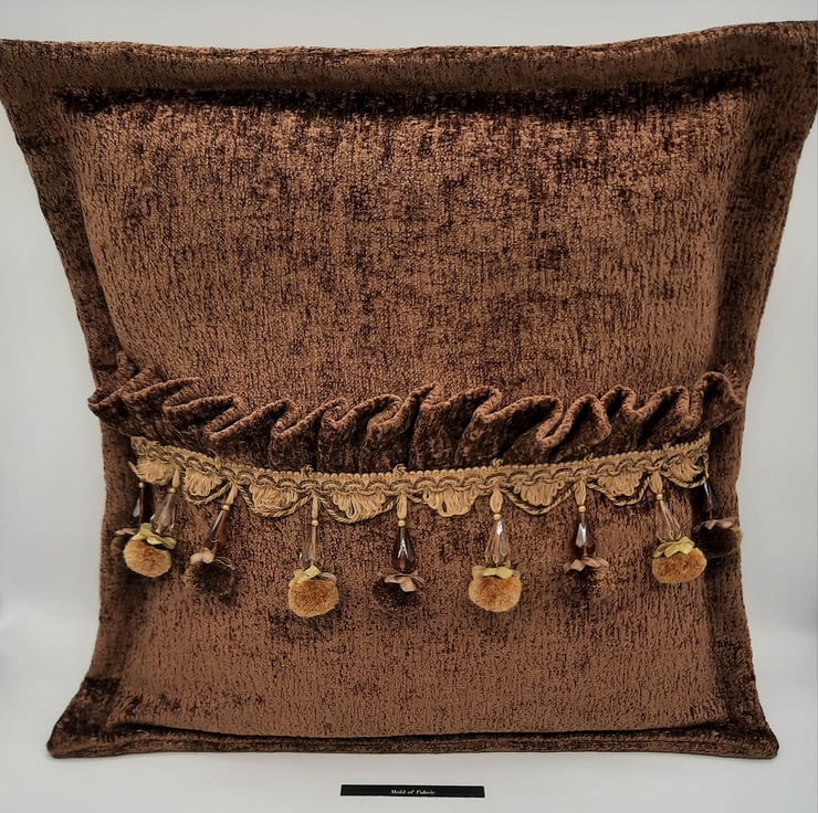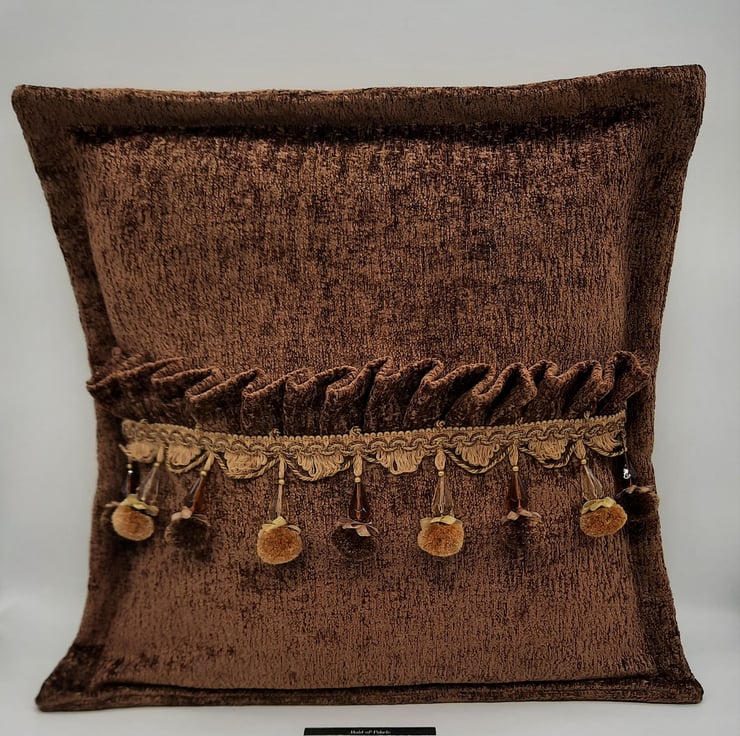 Brown soft to touch cushion cover. It has a frill detail across the centre with a tassel, pom pom trimming.