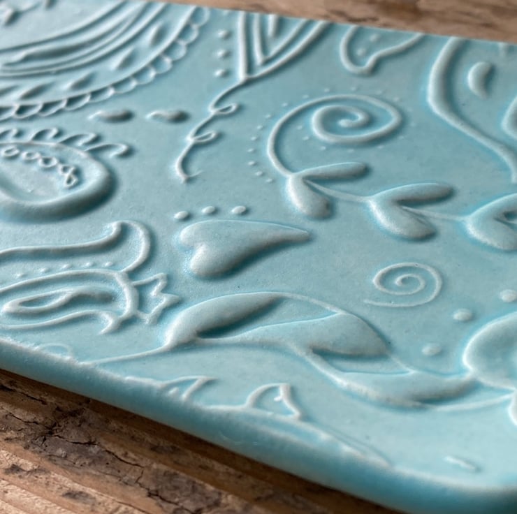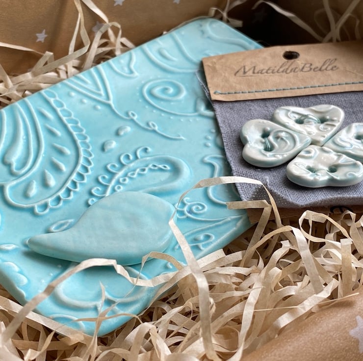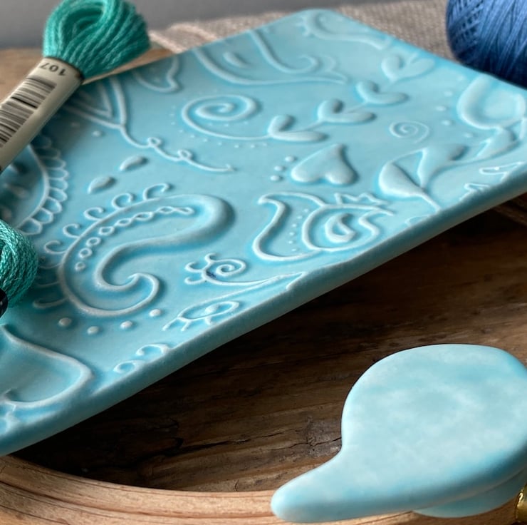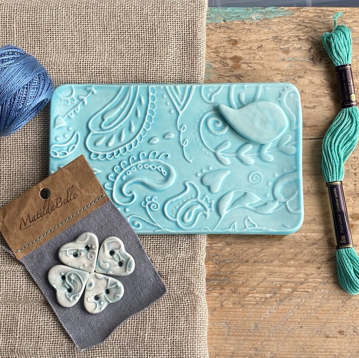 Inside, you'll find a beautifully crafted sewing tray, measuring 14.5 cm x 8.5cm, made from earthenware clay and imprinted with an original MatildaBelle paisley carving. It's glazed in a luxurious satin turquoise, adding an elegant touch to your sewing space. Perfect for holding your sewing scissors whilst crafting.