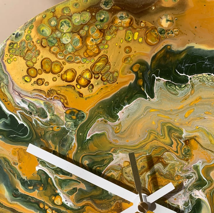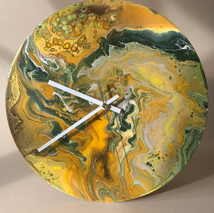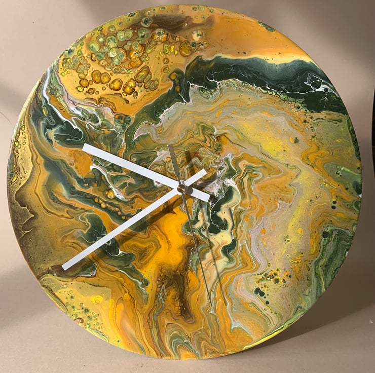 This 12”/30cm wall clock has been upcycled from a vinyl record. Painted using acrylics and gloss varnished using quality materials and finished with a felt backing for a clean look. It is fitted with a quartz mechanism ( ticking) and white hands.