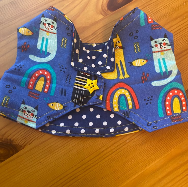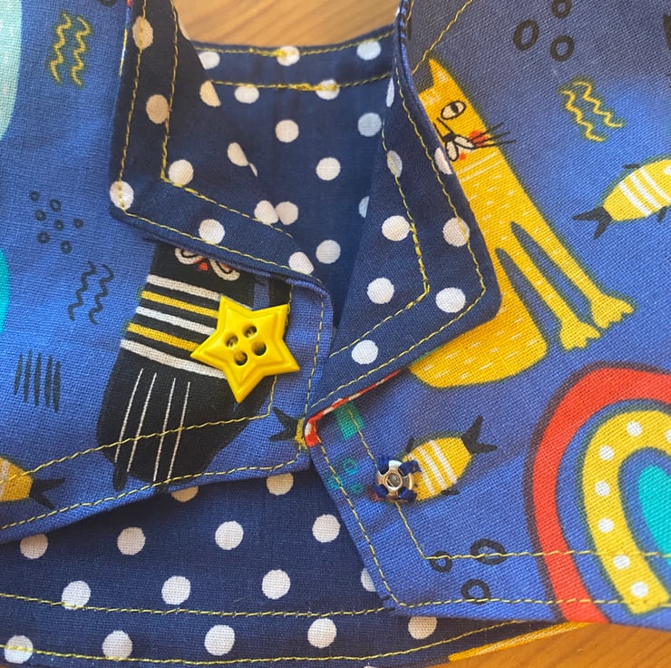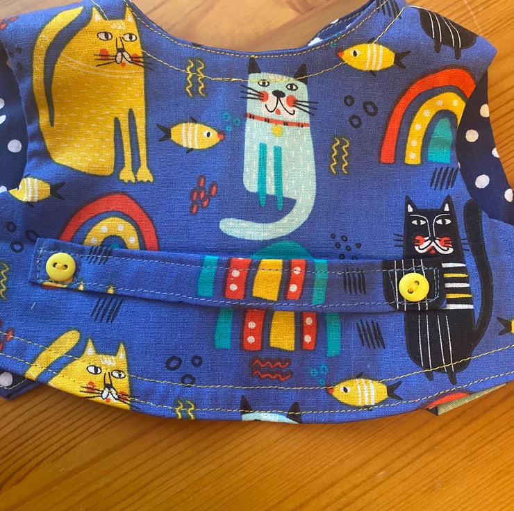 This is a really fun print of cats. The colours are bright mainly blue with yellow and other colours. The waistcoat is fully lined in a darker blue polka dot fabric.
