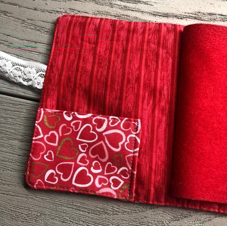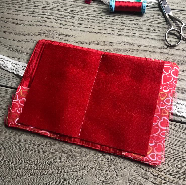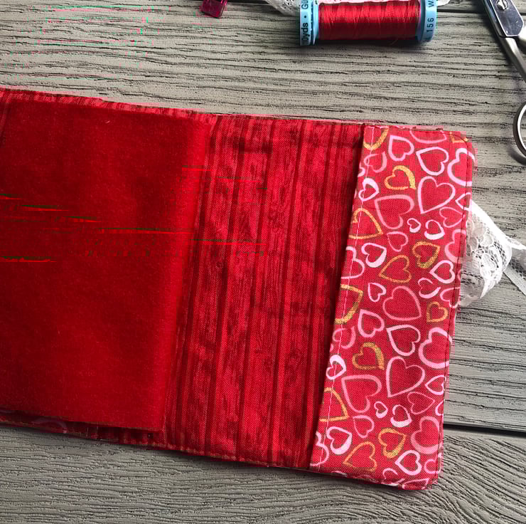 The cotton lining in red has two pockets for keeping sewing items in plus a piece of red wool felt for holding needle and pins. Two pieces of cream lace are used to tie the case together.