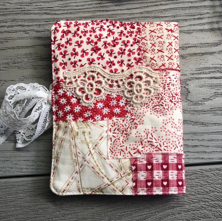 This delightful little needle case has been created from scraps of cream, white and red cotton hand sewn to a backing of calico with a variety of stitches in polyester thread and embroidery silk. Embellished with cream lace, a piece of tape measure,a red ribbon rose, a metal charm and a length of metal buttons recycled from an old necklace.