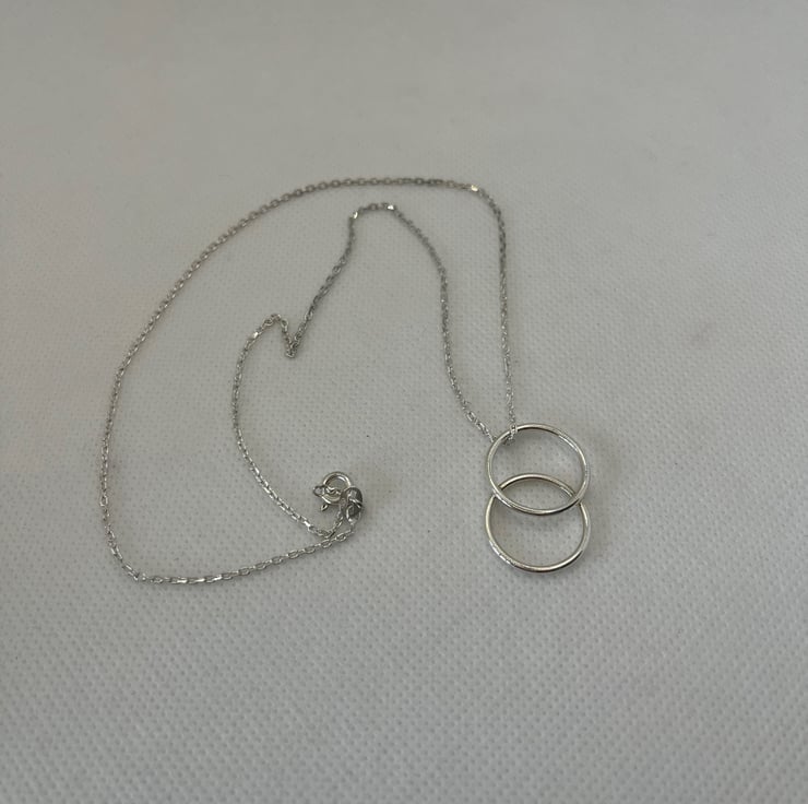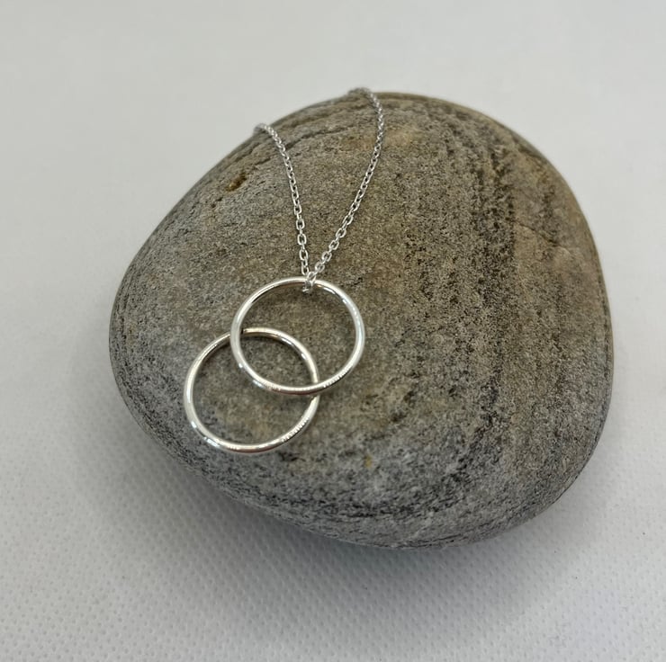 A beautifully simple and well crafted silver pendant necklace that is perfect for any outfit. The pendant was made by shaping 1.5mm sterling silver wire into two circles, each measuring approximately 1.75cm in diameter, which have been overlapped and soldered in place.