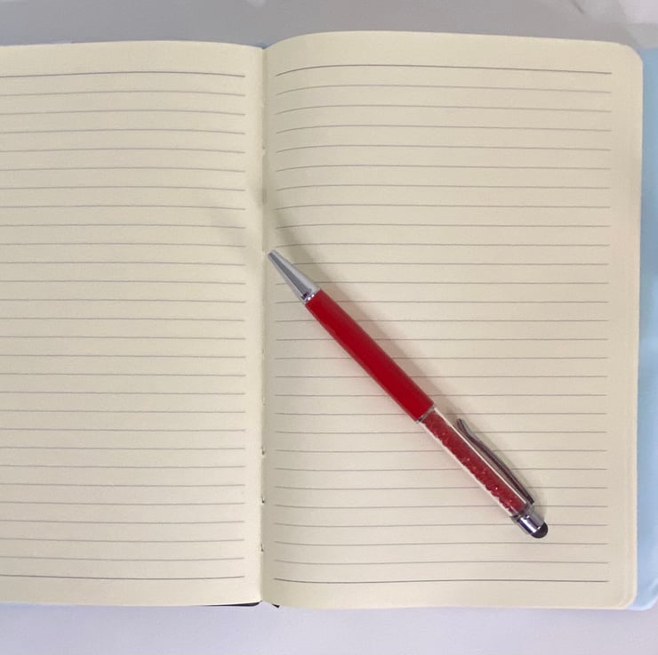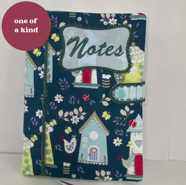 A lined hardback notebook is included. It is a standard A5 size so the cover can easily be put on a new notebook when this one is full!