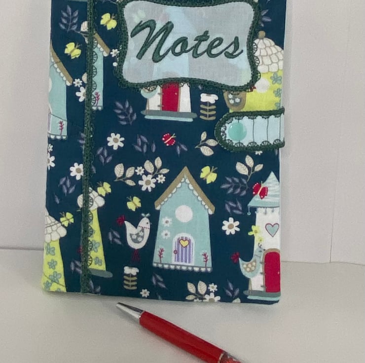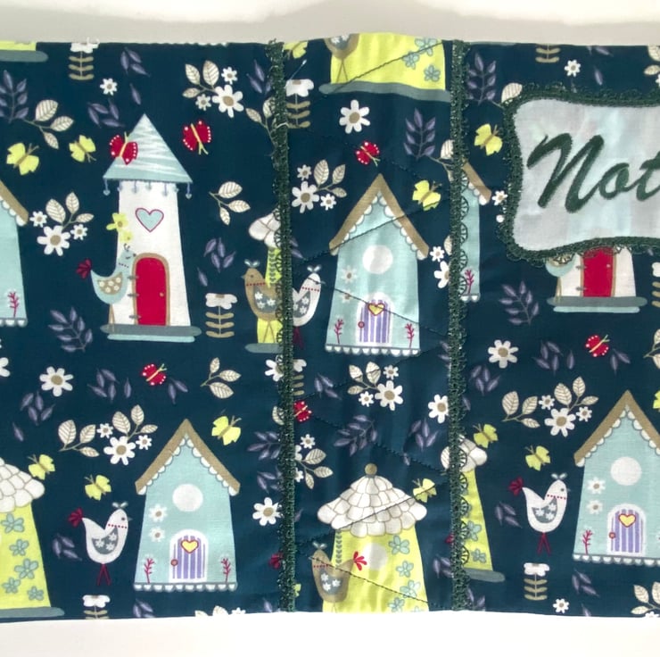 Padded cover featuring cute birds and birdhouses cotton fabric with decorative embroidery stitching around the front and back of the spine. The front of the book features an embroidery with the word 'Notes' and also has a closure tab with snap fastener. It is lined in plain sky blue cotton.