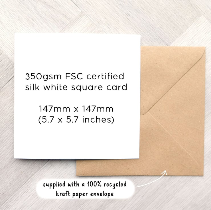 Printed on FSC certified 350gsm white silk card and supplied with a 100% recycled kraft paper envelope. This square card measures 147 x 147mm (5.7 x 5.7 inches).