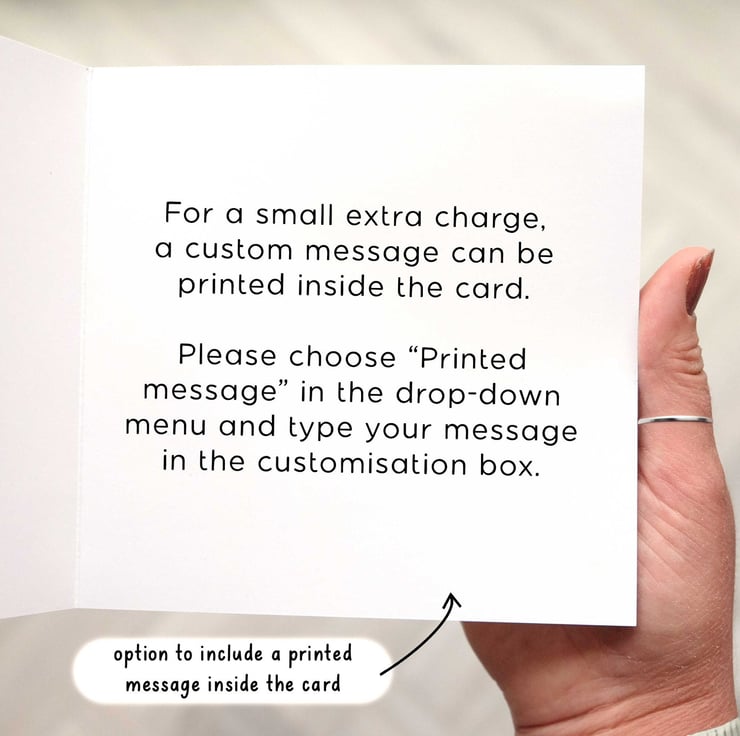 The card is blank inside as standard. For a small extra charge, a personalised message can be printed inside the card. Cards with messages added inside are non-returnable.