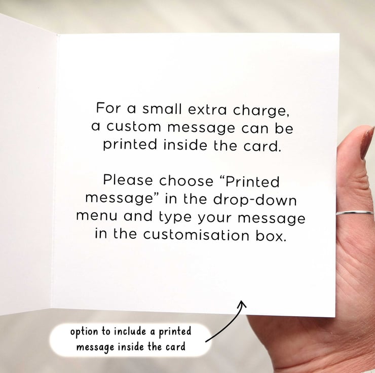 For a small extra charge, you can add a personalised message inside the card too. This is perfect if you would like to send the card directly to the recipient-- just make sure to enter their address as the delivery address at checkout!