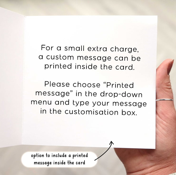 The card is blank inside as standard. For a small extra charge, a personalised message can be printed inside the card. Cards with messages added inside are non-returnable.