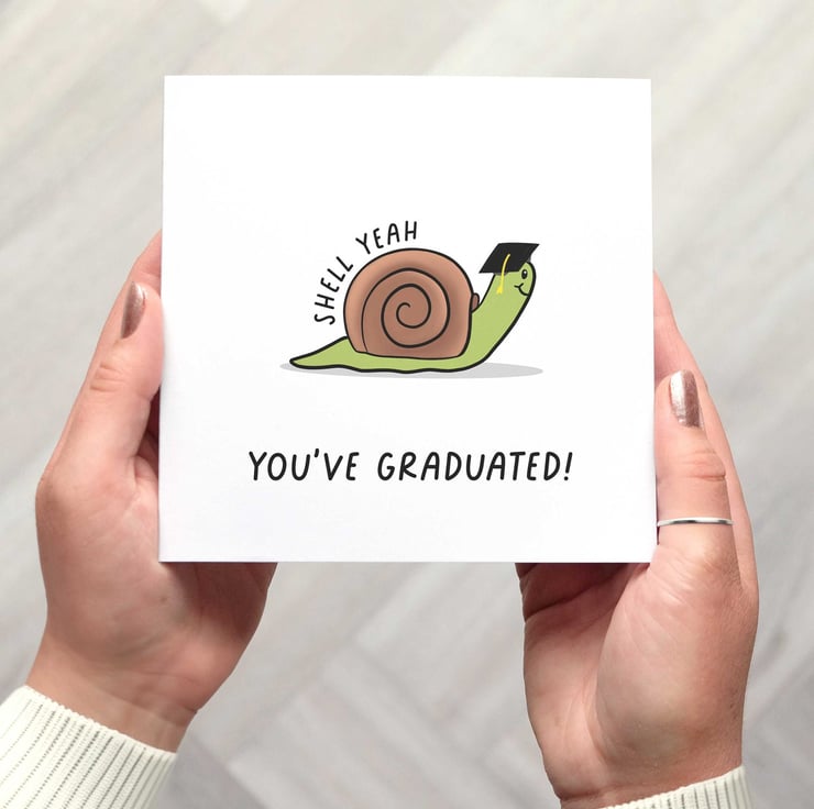 Pun graduation card featuring an illustrated snail wearing a graduation cap.