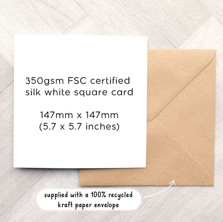 Printed on FSC certified 350gsm white silk card and supplied with a 100% recycled kraft paper envelope. This square card measures 147 x 147mm (5.7 x 5.7 inches).