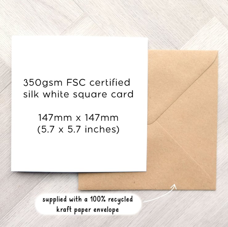 Printed on FSC certified 350gsm white silk card and supplied with a 100% recycled kraft paper envelope. This square card measures 147 x 147mm (5.7 x 5.7 inches).