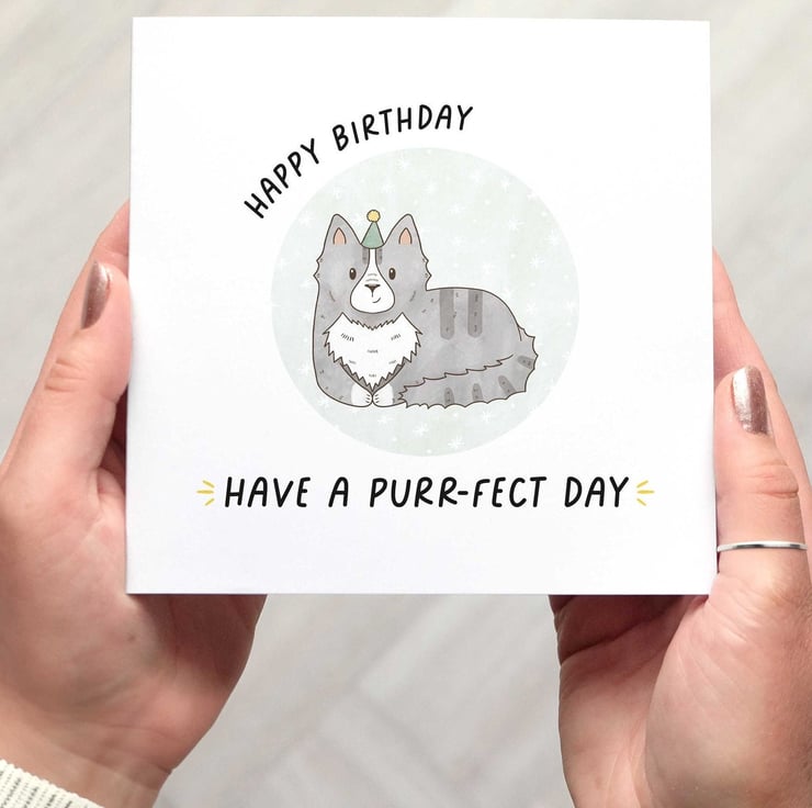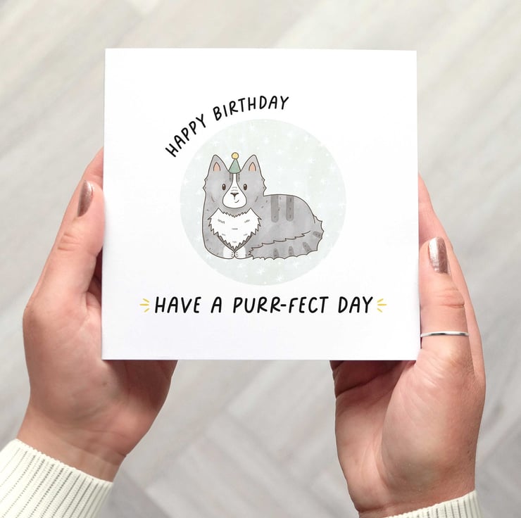 A cute pun birthday card featuring an illustrated smiling grey cat with dark stripes, white chest, muzzle and paws.