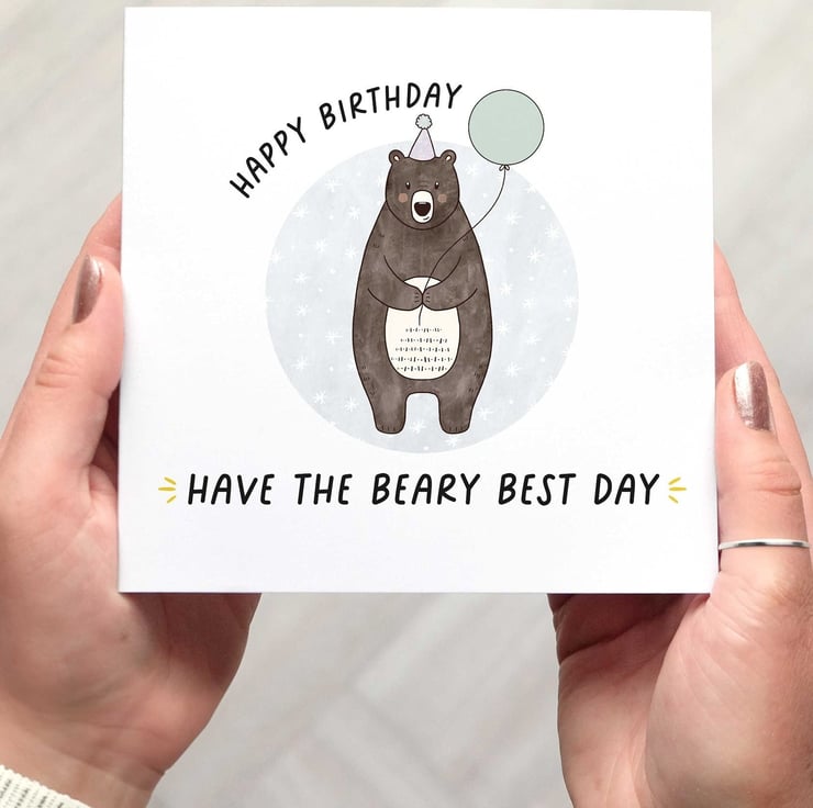 A cute pun birthday card featuring an illustrated bear wearing a party hat that is standing holding a balloon.