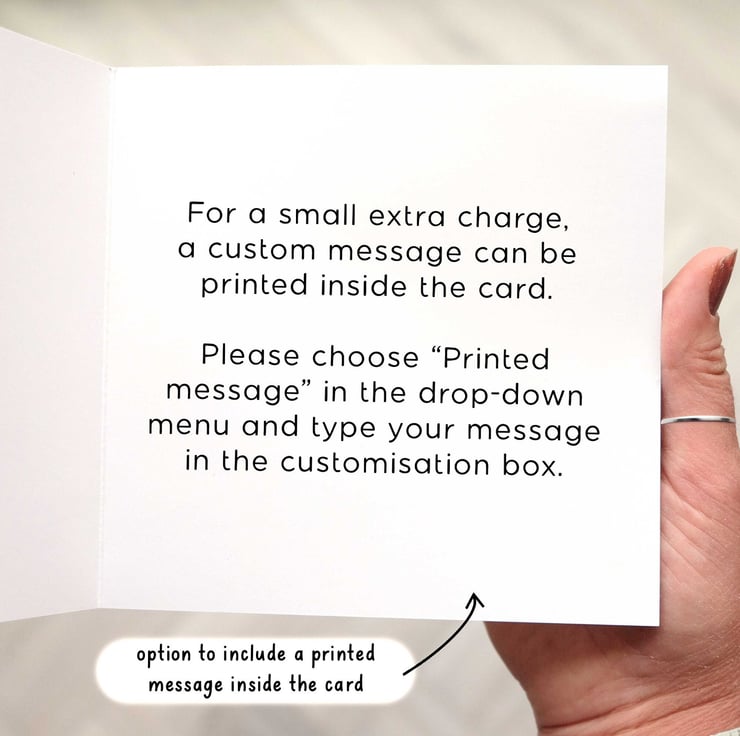 The card is blank inside as standard. For a small extra charge, a personalised message can be printed inside the card. Cards with messages added inside are non-returnable.