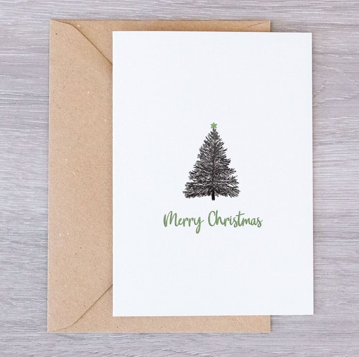 A minimalist Christmas card that is simple yet beautiful. Drawn digitally in a charcoal style, the tree has subtle green lights and is topped with a small star in the same colour.